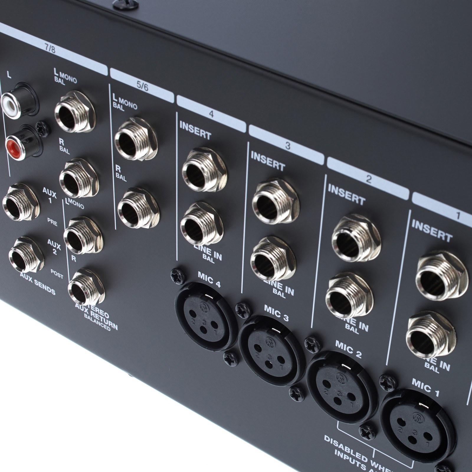 Wie es sich für einen klassischen Rackmixer gehört, befindet sich der Großteil der Anschlüsse des Alesis Multimix 10 Wireless auf dessen Rückseite. Damit ist er vor allem für Festverkabelungen ausgelegt. Neben seinen vier symmetrischen Monokanälen für Line-Signale und Mikrofone – die auch mit globaler Phantomspeisung betrieben werden können – bietet der Mixer Anschlussmöglichkeiten für Stereosignale per TRS- und auch Cinch-Stecker. Für den Bluetooth-Empfang steht auf der Rückseite eine Antenne bereit. Der Pairing-Taster befindet sich jedoch auf der Vorderseite des Mixers. Das gilt auch für zwei zusätzliche Mikrofoneingänge der ersten beiden Monokanäle. Somit können trotz Rackverkabelung auf die Schnelle auch mal weitere Mikrofone eingesetzt werden.