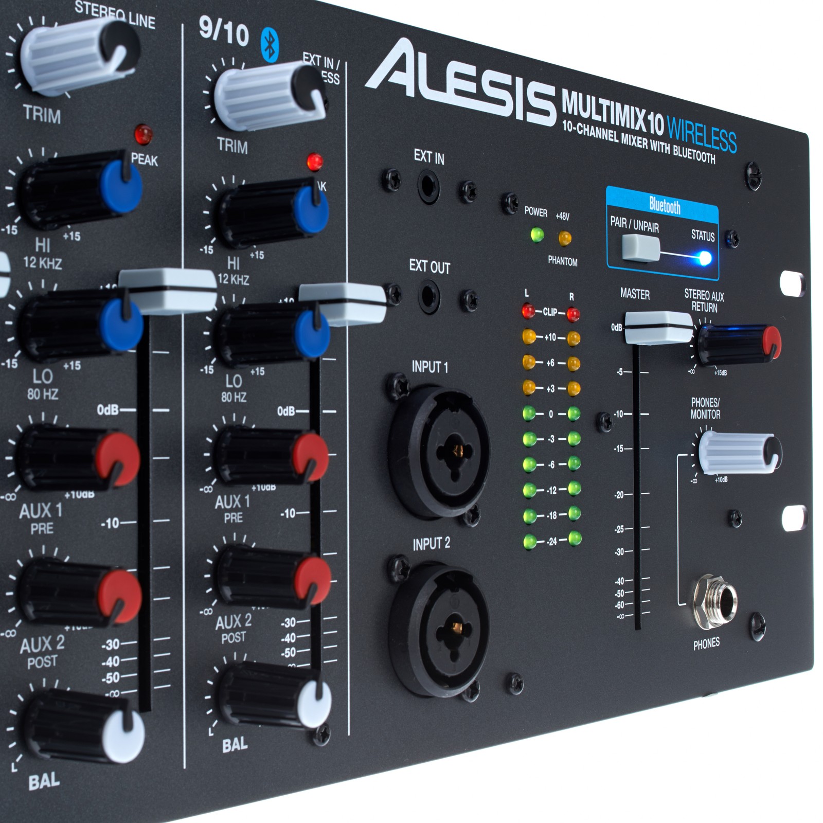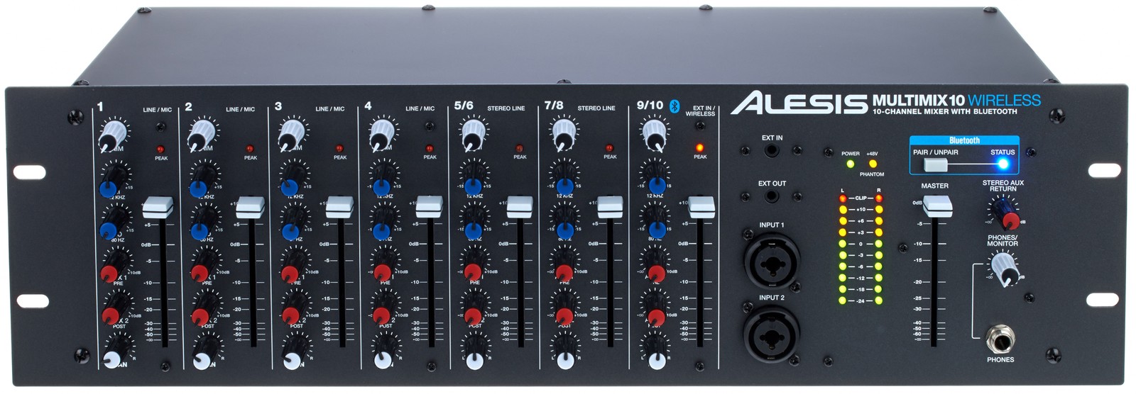 Trotz seines unscheinbaren Auftritts kann der Alesis Multimix 10 Wireless in Profiumgebungen nicht nur mit seinem symmetrischen Ausgang punkten. Mit seinem integrierten Netzteil lässt sich die Spannungsversorgung dieses Rack-Mischpults auch unkompliziert über einen gegebenenfalls im Rack vorhandenen Power-Conditioner/Stromaufbereiter beziehen. Zwar bietet dieser Mixer weder eine Recording-Funktion noch USB-Steckplatz oder Onboard-Effekte und auch auf eine Vorhörmöglichkeit muss verzichtet werden, doch ist der Alesis Multimix 10 Wireless mit seiner Bluetooth-Funktion eine große Hilfe für alle, die auch kabellos Musik in ihr ansonsten fest verkabeltes System einspeisen möchten.
