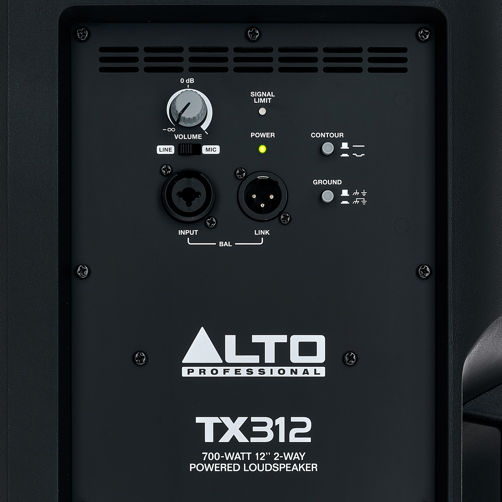 Der Eingänge des Alto TX 312 sind als XLR-Buchsen ausgeführt. Sie greifen Mikrofon- und Line-Signale auf. Sein XLR-Ausgang dient zum Weiterreichen des Lautsprechersignals per Kabel an einen weiteren Lautsprecher. Alle Anschlüsse sind symmetrisch ausgeführt. Dadurch werden auch lange Kabelwege ohne große Störeinflüsse möglich. Per Volume-Regler kann die Lautstärke des Lautsprechers feinjustiert werden. Der Stromanschluss ist als dreipoliger Kaltgerätestecker ausgelegt. Deshalb werden keine speziellen Kabel benötigt. Ein Ein/Aus-Schalter gibt volle Kontrolle darüber, wann der Lautsprecher aktiv sein soll.