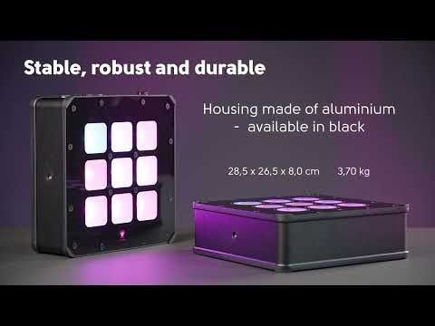 Der Ape Labs Marvel Flood will sich als leistungsstarkes LED-Akku-Licht für den professionellen Einsatz bei der Bühnen- oder Fassadenbeleuchtung als auch beim Uplighting empfehlen. Dafür zeichnet er sich durch die absolut zeitgemäße Konstruktion und Bedienbarkeit aus. Die 9 Pixel-LEDs mit einer jeweiligen Leistung von 18 Watt sorgen für ein homogenes Lichtbild. Und in Sachen Lichtqualität betritt der Flood ohne Übertreibung das nächste Level: Dank der Dual-Drive-Technologie entfällt die Pulswellenmodulation. Resultat ist eine flickerfreie Ansteuerung der LEDs bei einem Farbwiedergabeindex von CRI 90 und einem Abstrahlwinkel von 150°. Die erwünschte Farbvielfalt und facettenreiche Farbmischung ermöglicht der Chip mit RGB-WW-Spektrum sowie Kaltweiß und Lime. Die Farbtemperatur des Weißlichts ist zwischen 2700 und 6000K einstellbar.