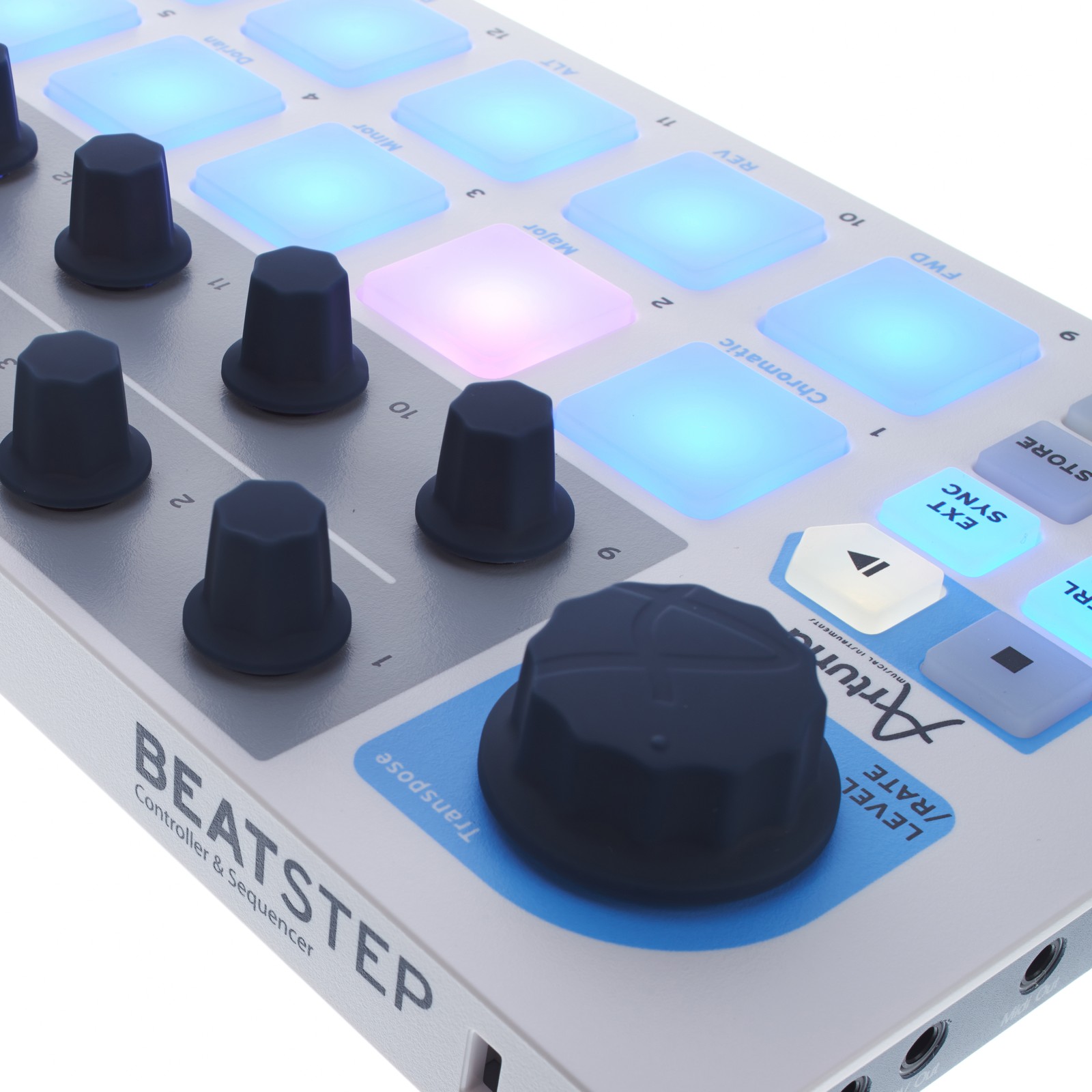 Der BeatStep von Arturia ist ein kleiner, handlicher USB-MIDI-Controller mit integriertem Sequenzer. Er bringt 16 berührungsempfindliche Pads, 16 endlos drehbare Encoder, sowie auch eine Transportsektion, mit der Sequenzen abgespielt und gespeichert werden können, mit. Ein links befindlicher, großer Encoder kann drei Funktionen steuern: Master-Pegel, Tempo und Tonhöhe der Sequenz. In Kombination mit einem Camera Connection Kit kann der BeatStep auch zusammen mit einem iPad verwendet werden. Der Class compliant USB-Treiber sorgt für eine reibungslose Erstnutzung an jedem Gerät - einfach anschließen und los geht's! Mit der Software „MIDI Control Center“ können diverse MIDI-Befehle individuell auf die einzelnen Pads und Encoder gelegt werden.