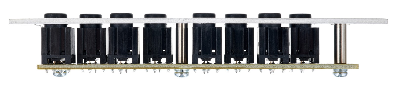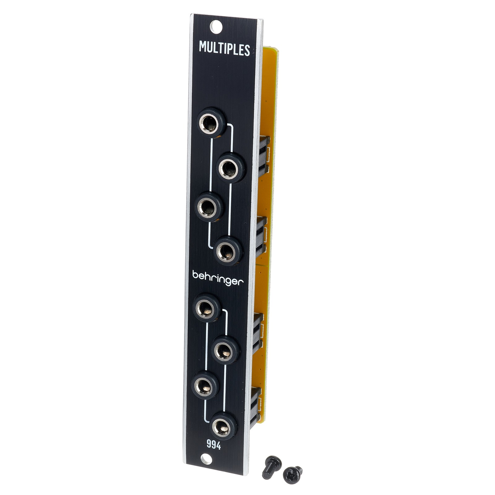 Das Modul 994 hat zwei unabhängige Multiple-Einheiten mit je vier Buchsen. Ein Multiple funktioniert ähnlich wie ein Stromverteiler. Wird in eine Buchse ein Signal eingespeist, liegt es an den anderen drei Buchsen parallel an und kann von dort zu unterschiedlichen Zielen gepatcht werden. Die Art des Signals spielt dabei keine Rolle, es kann sich um eine CV-Spannung, ein Gate bzw. Trigger oder auch ein Audiosignal handeln. Das Modul 994 arbeitet passiv, d.h. es braucht keine Stromversorgung über den Systembus. Bei der Verteilung der Signale kommt es zu einem minimalen Signalverlust, der in der Regel nicht ins Gewicht fällt. Einzig für die Anwendung mit einer Tonhöhenspannung (Key-CV) ist ein passives Multiple ungeeignet, da es hier zu wahrnehmbaren Veränderungen in der Tonhöhe kommt. Auch das Mischen mehrerer Eingangssignale ist mit einem Multiple nicht möglich.