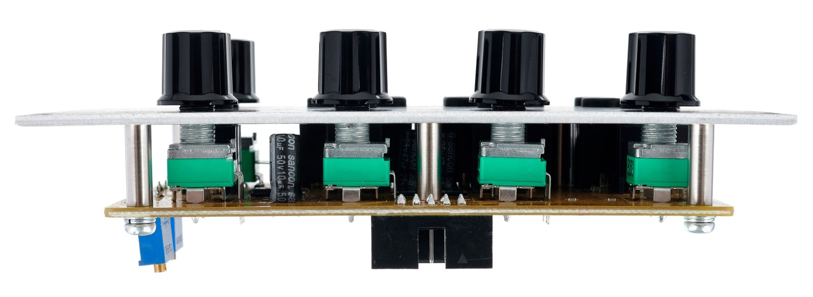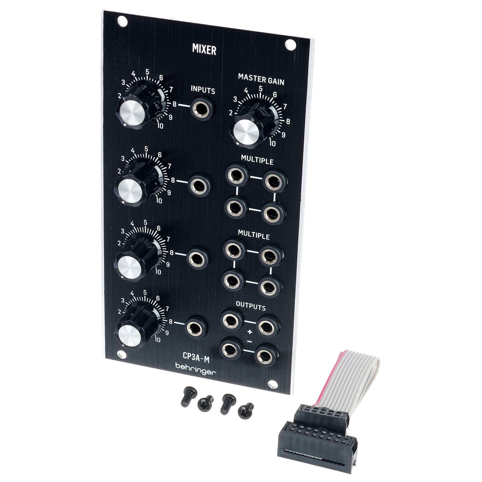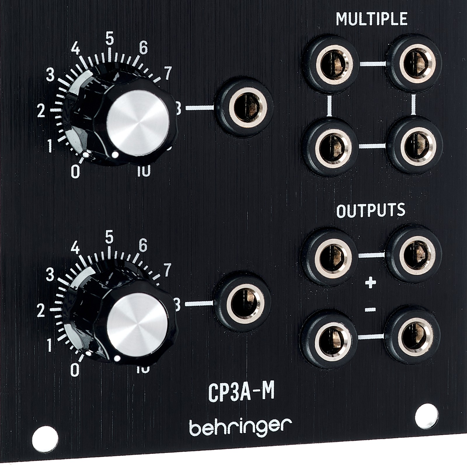 Das Modul CP3A-M ist ein Mixer mit vier Eingängen. Die Schaltung ist komplett diskret ohne ICs und mit passiven Signalabschwächern aufgebaut. Bei geringem Pegel bleibt der Klang sehr sauber, bei hohen Pegel ist aber auch eine angenehm klingende Sättigung möglich. Für den Ausgang ist ein Master-Regler vorhanden, mit dem sich das gesamte Mix-Signal regeln lässt. Das Mix-Signal liegt an zwei parallelen Ausgängen sowie an zwei weiteren, invertierten Ausgängen an, sodass es sich bei Bedarf zu verschiedenen Zielen patchen lässt. Zusätzlich sind zwei unabhängige Vierfach-Mulitiples vorhanden, mit denen beliebige Signale verteilt werden können. Da die Multiples passiv sind, kommt es zu einem minimlaen Signalverlust, der zwar in der Regel nicht ins Gewicht fällt, allerdings für die Anwendung mit einer Tonhöhenspannung (Key-CV) ungeeignet ist.