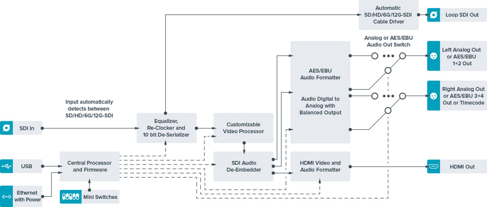 Mit dem Teranex Mini SDI to HDMI 12G ist es möglich, von SDI kommende Videosignale zu konvertieren und über HDMI 2.0 auszugeben. Das ermöglicht beispielsweise die Nutzung von regulären Fernsehern und Monitoren zur Überprüfung des Signals oder Projektoren bei Live-Veranstaltungen. Um den Konverter zwischen unterschiedliche Schritte des Arbeitsablaufs schalten zu können, gibt es außerdem einen SDI-Loop-Ausgang, welcher das Signal vom SDI-Eingang einfach weiterleitet. Ein Timecode kann via XLR ausgegeben werden, wie auch Soundspuren. Softwareupdates lassen sich über den USB-Anschluss einspielen. Erweitern lassen sich die Modelle der Teranex-Mini-Serie mit dem Teranex Mini Smart Panel, welches direkt am Gerät einen Überblick über die aktuell konvertierten Spuren und außerdem Zugriff auf das Menü gibt.