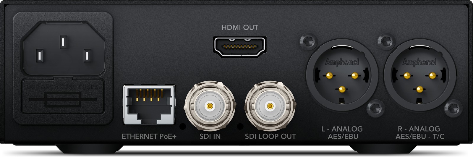 Mit den Einsatzorten ist man kaum eingeschränkt, egal ob im Rack, in welches pro Höheneinheit drei der Teranex-Mini-Konverter nebeneinander passen, oder mit den mitgelieferten Füßen auf dem Schreibtisch. Egal, ob stationär oder mobil. Damit ist man flexibel bei der Skalierung des Systems und kann die Geräte des Blackmagic-Systems in Produktionen unterschiedlichster Größe einsetzen. Empfohlen wird außerdem die Verwendung eines Teranex Mini Smart Panels. Dieses ermöglicht die Kontrolle der aktuell konvertierten Spuren und gibt direkten Zugriff auf das Menü. Zum Gerät wird auch ein Kaltgerätekabel benötigt, sofern man es nicht über den Ethernet-Port mit Strom versorgen kann oder will (PoE+).