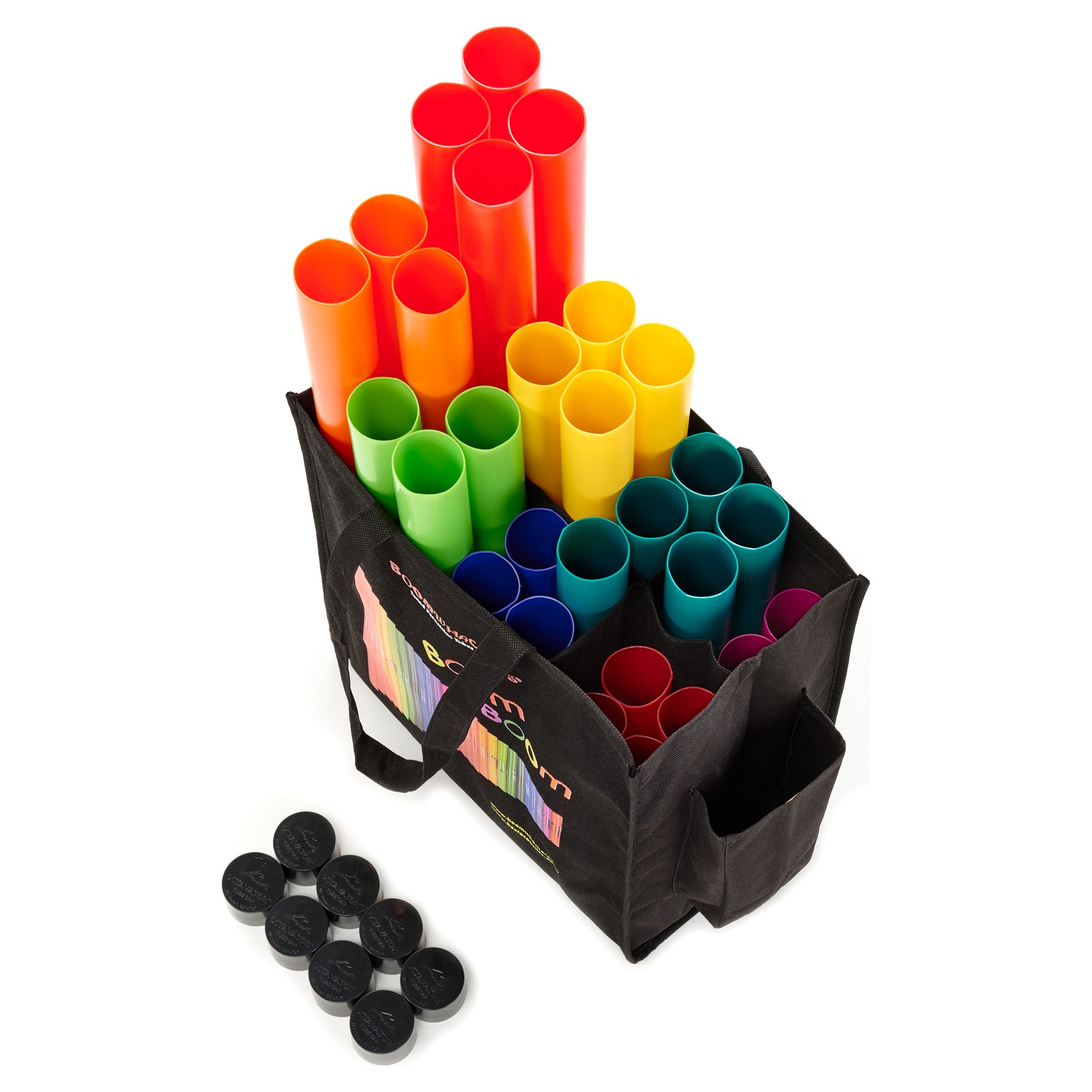 Das Boomwhackers In Concert Set besteht aus 28 Boomwhackers und enthält die Stammtöne der C-Dur Tonleiter zwischen dem eingestrichenen und zweigestrichenen c in jeweils zwei- bis fünffacher Form. Das Set ist so zusammengestellt, dass es direkt mit dem Standardwerk „Boomwhackers in Concert“ (nicht enthalten) verwendet werden kann. Ein Satz aus acht Oktavierungskappen erlaubt es, einzelne Boomwhackers um eine Oktave nach unten zu transponieren. Das Set kann bei Bedarf durch einen chromatischen Ergänzungssatz oder auch durch einen zusätzlichen Bass-Satz erweitert werden und wird mit einer praktischen Tragetasche für Transport und Aufbewahrung geliefert.