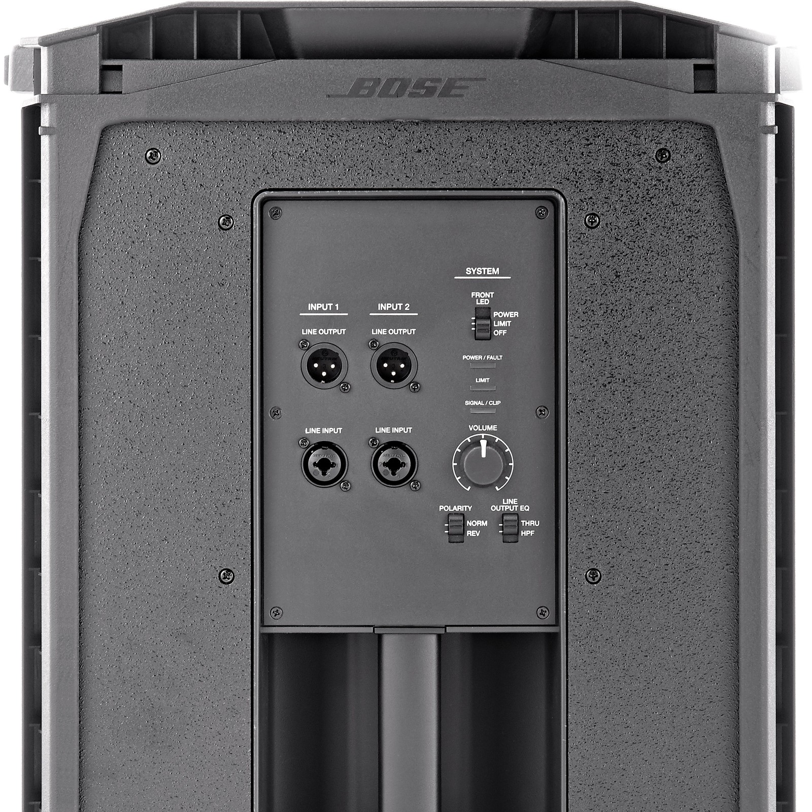 Der Fullrange-Lautsprecher Bose F1 Complete Bundle überzeugt mit einem maximalen Schalldruckpegel von nicht weniger als 132 dB. Er arbeitet in einem Frequenzbereich von 43 bis 20000 Hz und hat eine Nennleistung von 1000 Watt. Die Nennabstrahlung liegt bei maximal 100° horizontal und 40° vertikal. Vor einem 12“-Woofer liegen übereinander acht Mittelhochtontreiber. Im Subwoofer F1 machen zwei High-Excursion-10 Zoll-Treiber bei 1000 Watt Leistung und einem Frequenzgang von 40 bis 100 Hertz ordentlich Druck. Bedienfelder und Anschlüsse findet man auf den Rückseiten. Am Model 812 hat Input 1 eine XLR-/Klinke-Kombibuchse. Input 2 bietet einen Stereo-Cinch-Anschluss und einen Klinkeneingang. Der Sub hat zwei, das Array einen XLR-Out. Auf der Ober- und der Rückseite des Subs ist jeweils mittig ein stabiler Tragegriff eingebaut. Das Array hat eine spezielle zuschaltbare EQ-Einstellung zum Einsatz mit dem Sub F1. Die Front-LEDs beider Boxen können deaktiviert werden.