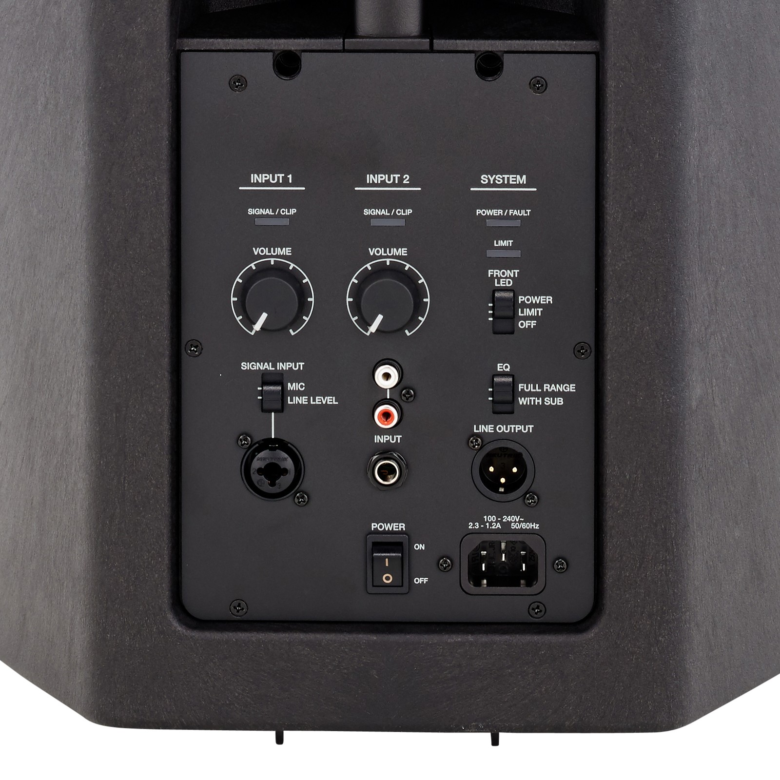 Der Fullrange-Lautsprecher Bose F1 Model 812 überzeugt mit einem maximalen Schalldruckpegel von nicht weniger als 132 dB. Er liefert in einem Frequenzbereich von 43 bis 20000 Hz und hat eine Nennleistung von 1000 Watt. Die Nennabstrahlung liegt bei maximal 100° horizontal und 40° vertikal. Vor einem 12“-Woofer liegen übereinander acht Mittelhochtontreiber. Auf dem übersichtlichen, rückseitig angebrachten Bedienfeld sind über der Netzbuchse mit Schalter zwei Inputkanäle und ein XLR-Line-Out vorhanden. Für den EQ gibt es eine Fullrange-Einstellung und eine weitere für den Einsatz mit einem optional erhältlichen F1-Subwoofer. Auch die Front-LED kann hier deaktiviert werden. Input 1 hat eine XLR-/Klinke-Kombibuchse. Input 2 bietet einen Stereo-Cinch-Anschluss und einen Klinkeneingang. Die Klinken-Inputs beider Kanäle sind sowohl für symmetrische als auch unsymmetrische Signale ausgelegt.