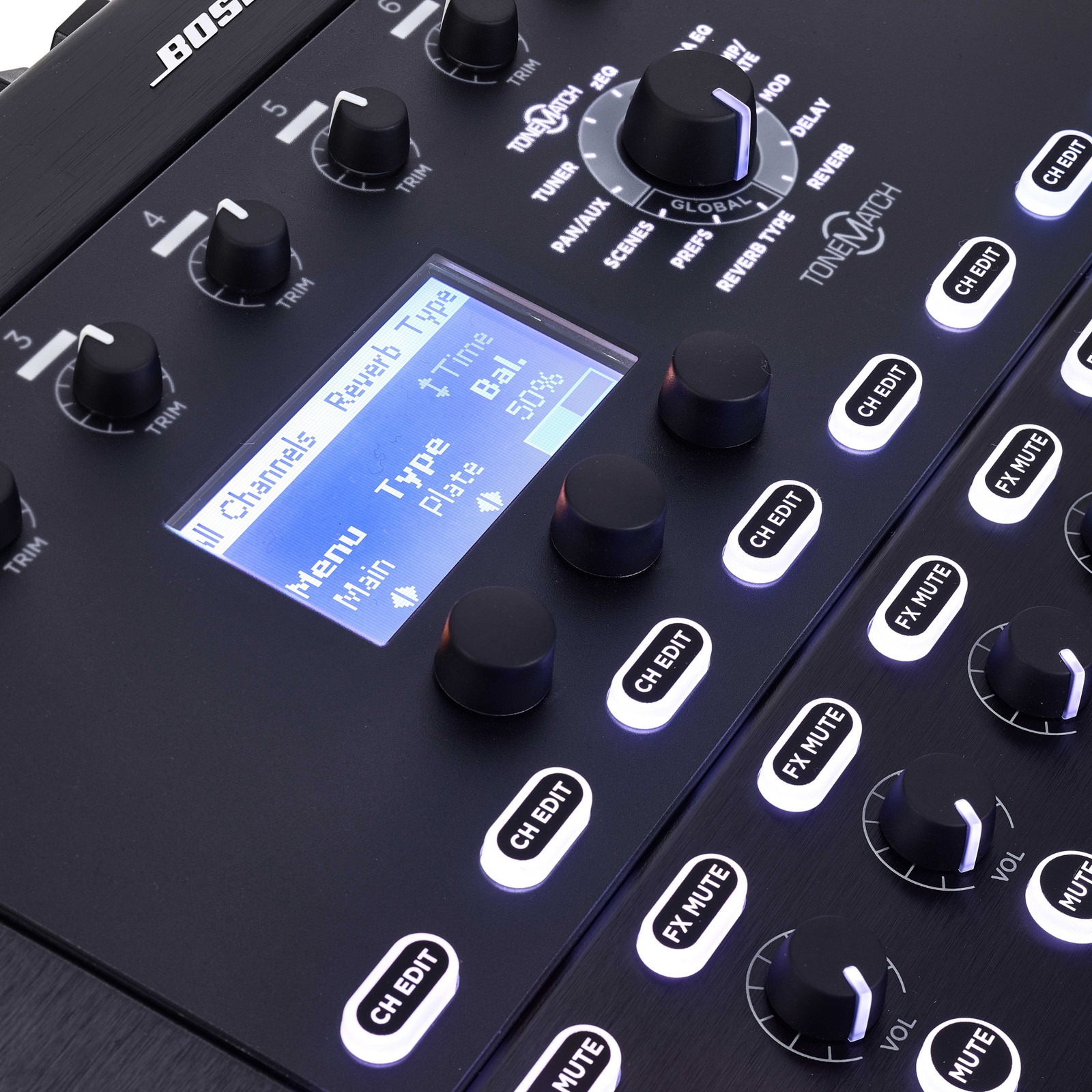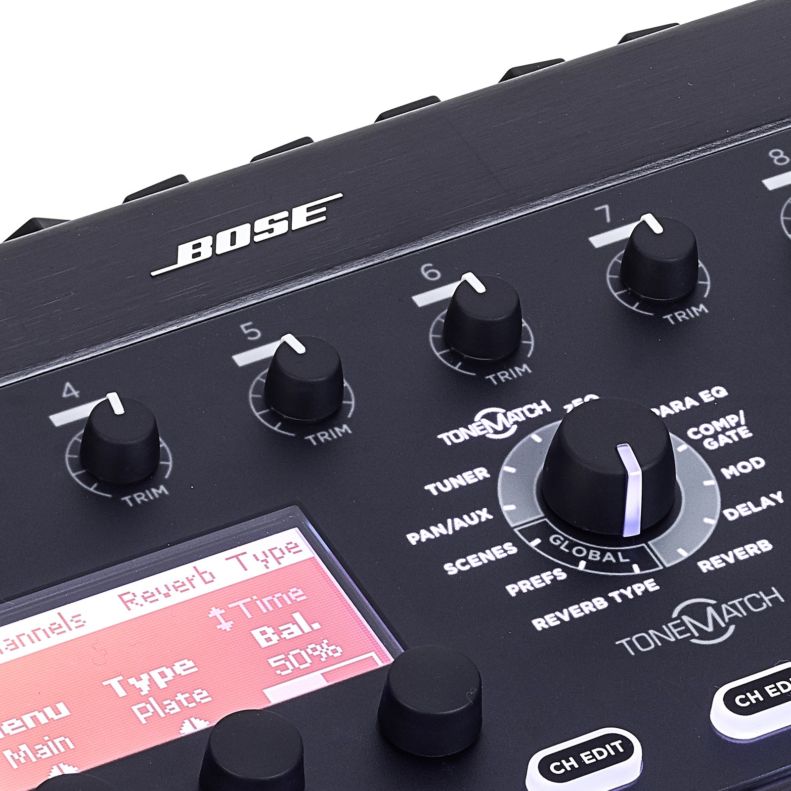Der T8S Mixer von Bose ist ein erstaunlich kleines 8-Kanal-Mischpult mit einer großen Effektsektion in Studioqualität. Es ist gemacht für Musiker, die intuitiv ihren eigenen Sound kreieren möchten. Hat man einmal seinen Wunschsound gefunden, kann man ihn als Szene abspeichern und ist beim nächsten Soundcheck schnell startklar. Auch ein Stimmgerät ist an Bord. Der T8S hat eine tourfreundliche Abdeckung aus stabilem Kunststoff, die mit einem Magneten gehalten wird. Auf der Bühne kann das Pult auf jedes handelsübliche Stativ mit 1/4“-Gewinde geschraubt und unauffällig beiseite gestellt werden. So hat man auch während des Auftritts die volle Kontrolle über den eigenen Sound inklusive Ausgangspegel und kann für bestimmte Songs vorbereitete Effekte aufrufen.