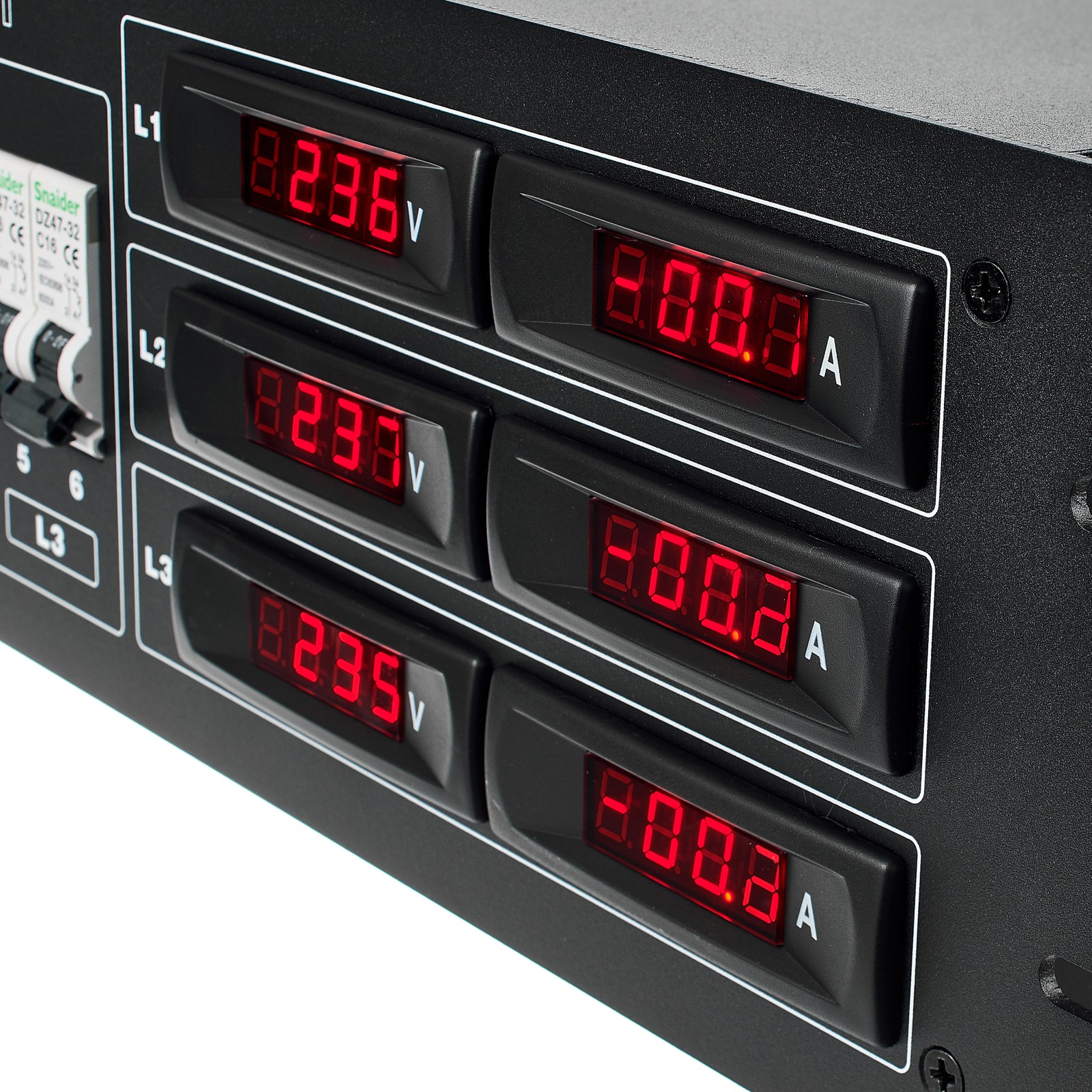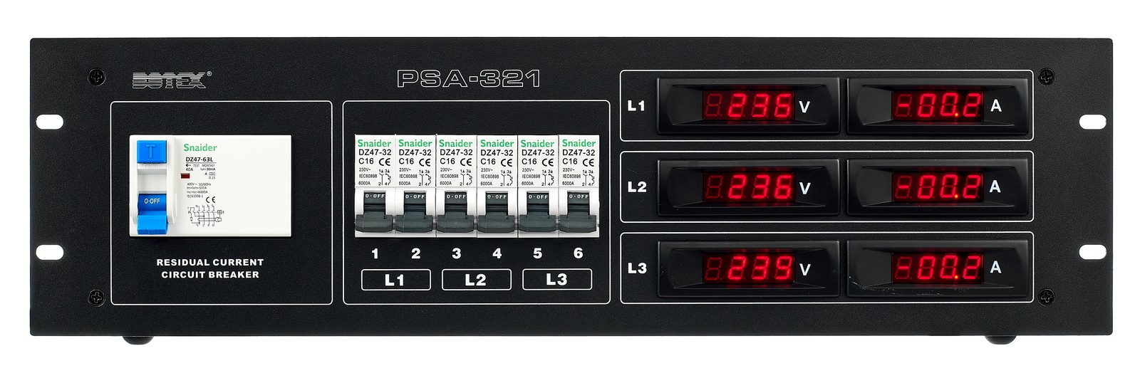 Der Botex PSA 321 Stromverteiler ist ein 19"-Stromverteiler mit 32A Belastbarkeit. Dank Schutzkontaktsteckdosen mit Klappdeckeln verteilt er den Strom von den drei Phasen eines Starkstromanschlusses auf Bühnen, in Veranstaltungsräumen und auf Festivals an ganze sechs hungrige Verbraucher – und mittels CEE32A-Dose kann er diesen sogar noch an einen weiteren Unterverteiler weiterreichen. Seine Schutzkontaktdosen sind separat mit Sicherungsautomaten ausgestattet. Die sechs Leitungsschutzschalter lösen jeweils bei 16A aus. Zusätzlich sorgt ein globaler FI für Schutz bei Fehlerströmen, während der Auslösetaster eine noch höhere Betriebssicherheit bietet. Für jede der drei Starkstromphasen zeigen separate vierstellige Digitaldisplays die jeweilig bereitgestellte Spannung in Volt und die beanspruchte Last in Ampere an.