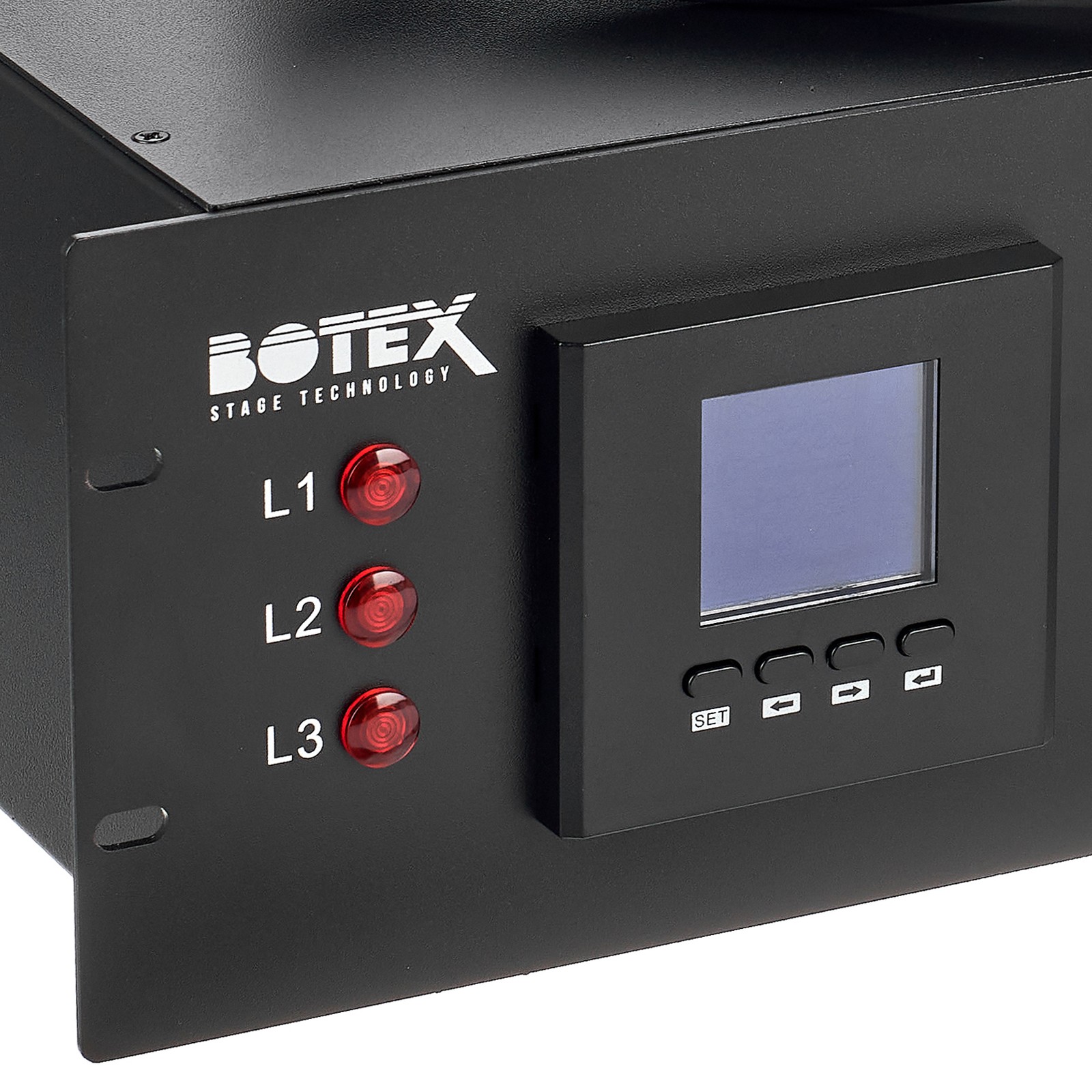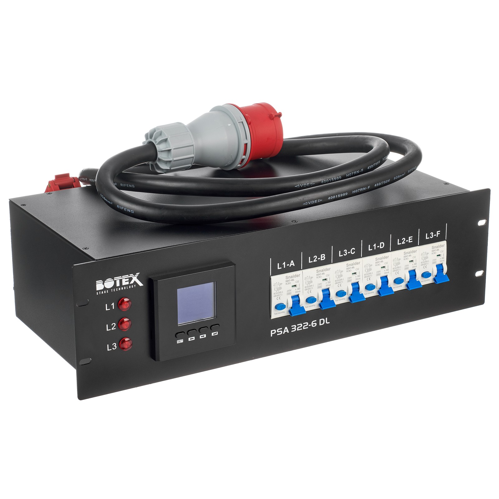 Der Botex PSA 322-6 DL ist ein 19"-Stromverteiler mit 32 A Belastbarkeit. Mit ihm lässt sich auf Bühnen, in Veranstaltungsräumen und bei Festivals zuverlässig Strom von einem Starkstromanschluss verteilen und dank CEE32A-Dose an weitere Verteiler weiterreichen. Seine sechs Schutzkontakt-Steckdosen mit Klappdeckel sind mit einem kombinierten RCBO, also Fehlerstromschutzschalter mit Leitungsschutzschalter, ausgestattet. Anders als bei vielen Konkurrenzmodellen, bietet dieser Stromverteiler für jeden einzelnen Stromkreis einen unabhängigen Fehlerstromschalter statt einen globalen FI. Als Besonderheit bietet jede Unterverteilung zusätzlich eine Power-Twist-Buchse. Sein digitales Messinstrument zeigt per hintergrundbeleuchtetem LED-Display für jede der drei am Eingang des Geräts anliegenden Starkstromphasen sowie für deren Summe die Spannung, die Last in Ampere und die Wirkleistung in Watt an. Der integrierte Verbrauchszähler zeigt ganz praktisch in kWh die Höhe des Stromverbrauchs an.