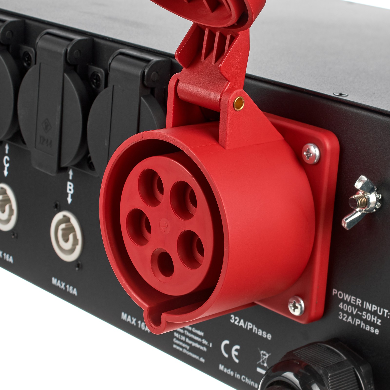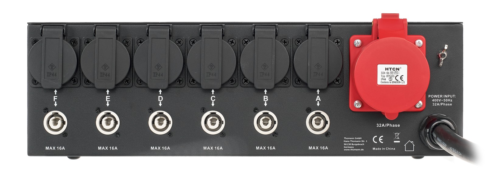 Wie für Stromverteiler dieser Klasse üblich, bietet auch der Botex PSA 322-6 DL einen CEE32A-Eingang, der – wie seine rote Farbe schon andeutet – für die Dreiphasenwechselstrom-Spannungsebene von 380 bis 480 V ausgelegt ist. Damit die Erwärmung der Nutzleitungen nicht zu groß werden kann, handelt es sich bei den verbauten RCBO C16-Sicherungen um Fehlerstromschutzschalter mit Sicherungsautomaten, die für einen Bemessungsstrom von 16 A ausgelegt sind. Die Zuleitung dieses Verteilers ist eine fünfadrige Gummischlauchleitung mit einem Leiter-Nennquerschnitt von je 6 mm². Durch seine separaten Sicherungen sorgt dieser Botex-Verteiler bei Veranstaltungen dafür, dass beim Auslösen durch einen Verbraucher nicht auch alle anderen Verbraucher ausfallen. So steht die Location nicht mitten im Event auf einen Schlag komplett ohne Ton und Licht da.