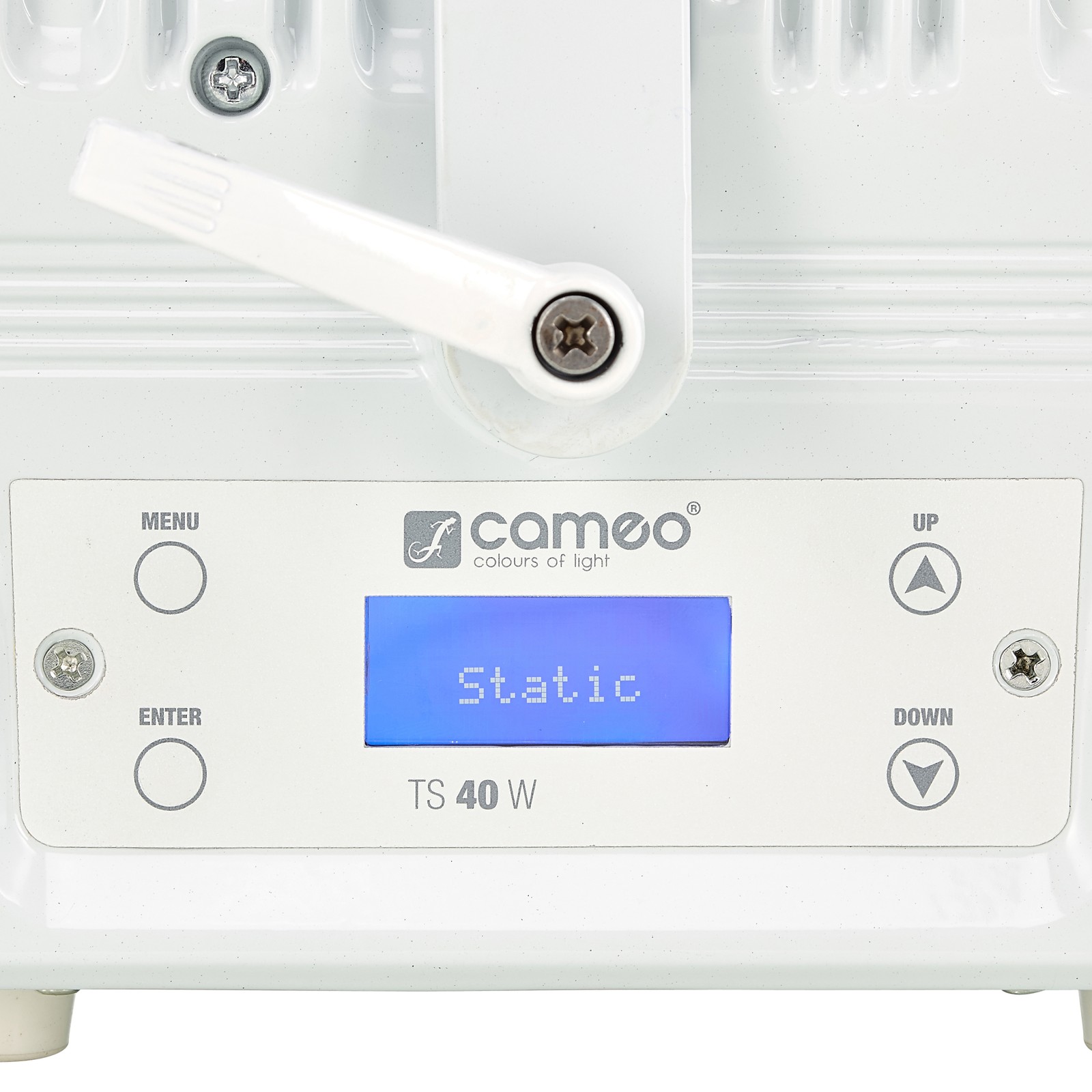 Der Cameo TS 40 WW LED Theater-Spot Wh setzt Lichtakzente auf kleinen Bühnen, auf denen Scheinwerfer mit weißem Gehäuse zum Einsatz kommen sollen, wobei die Beleuchtung des Displays so eingestellt werden kann, dass sie 30sec nach der letzten Eingabe automatisch erlischt, damit die Aufmerksamkeit der Zuschauer ganz auf die Vorstellung gelenkt wird. Auch als Begleiter für Tourneetheater eignet sich der lüfterlose und somit sehr leise LED-Scheinwerfer, braucht man für ihn doch kein ins Gewicht fallendes Dimmerpack. In kleinen Clubs kann man mit dem TS 40 WW einzelne Musikerpositionen ausleuchten. Darüber hinaus setzt er als Stroboskop Akzente. Apropos Akzente, in Galerien, Showrooms und Ladengeschäften beleuchtet er gezielt Objekte, wobei er dank seines feststellbaren Bügels punktgenau gedreht und geneigt werden kann.