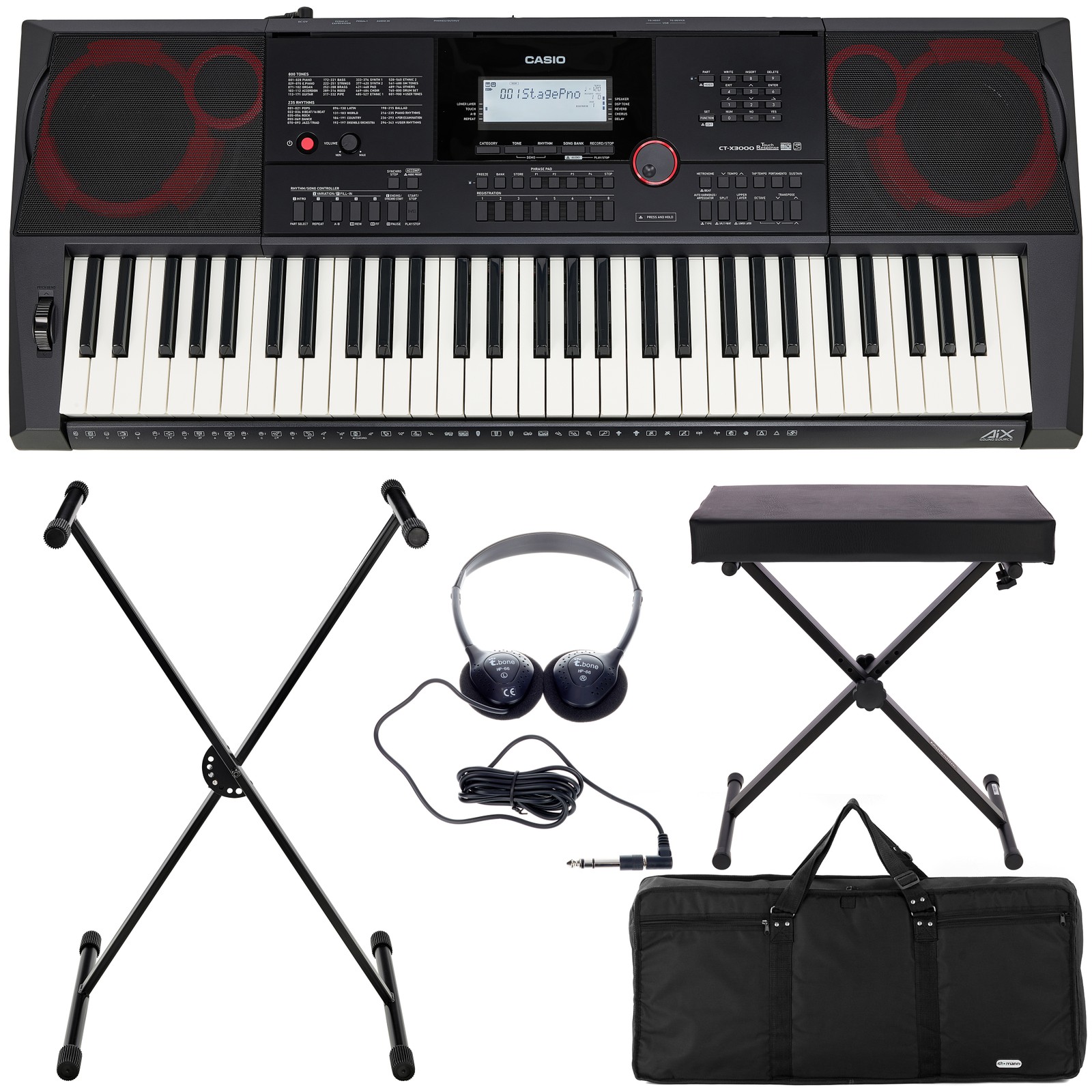 Das Casio CT-X3000 Deluxe Bundle ist eine Erstausstattung mit featurestarkem Keyboard zum Einstieg in die Songproduktion. Aus herausragend vielen Klangfarben und Rhythmen können eigene Titel gebaut werden. Die 61 Tasten haben eine einstellbare Anschlagdynamik. Zahlreiche Features bringen eine Menge Möglichkeiten fürs Komponieren. So können mehrere Loops erstellt oder Melodien mit Harmonien unterlegt werden. Zahlreiche Effekte lassen sich einbauen. Auf den Speicherplätzen ist neben Presets genug Platz, um eigene Ideen festzuhalten. Schaut man auf die Menge der Anschlüsse, ist das CT-X3000 ebenfalls breit aufgestellt. Von USB über MIDI bis zu einem Audio-Input ist einiges an Bord. Und mit dem integrierten Mixer können Songs sogar abgemischt werden. Das im Deluxe Bundle enthaltene Keyboardstativ, die Tasche, eine Sitzbank und ein kleiner Kopfhörer runden die Ausstattung ab.