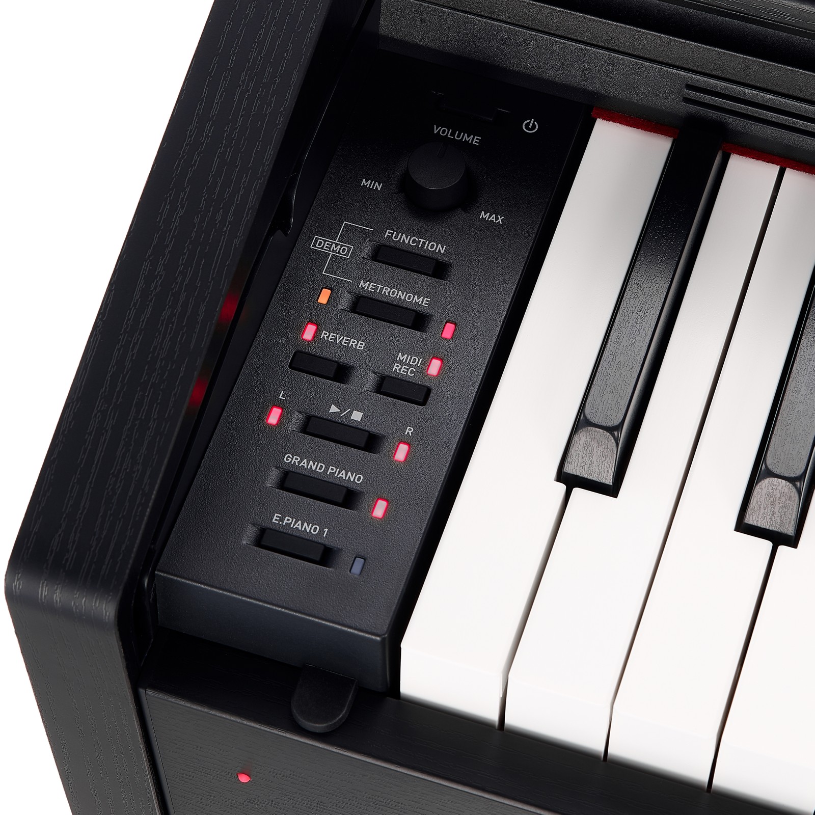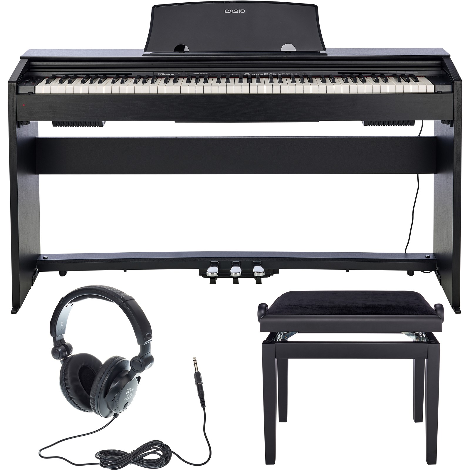 Das Casio PX-770 BK Privia Set zaubert mit seinen 88 anschlagdynamischen Tasten 19 Klangfarben. Von verschiedenen Flügel- und Klaviernuancen über Cembalo bis Bass ertönt der Sound 128-stimmig polyphon aus zwei 8 Watt-Lautsprechern mit zwölf Zentimetern Durchmesser. Dämpferresonanz und Hammerdynamik können eingestellt werden. Die Musikbibliothek offeriert 60 Songs. Mit Orchesterbegleitung sind zehn Titel vorhanden. Bei beiden können die Hände zum Üben einzeln zugeschaltet werden. Der MIDI-Recorder hat Platz für einen zweispurigen Song. Bedient wird das PX-770 BK Privia Set, nachdem man es mit Strom versorgt hat, mit Buttons links neben der Klaviatur, teilweise in Kombination mit den Tastaturtasten. Der Kopfhörer ist geschlossen, hat drehbare Ohrmuscheln und überzeugt durch geringes Gewicht.