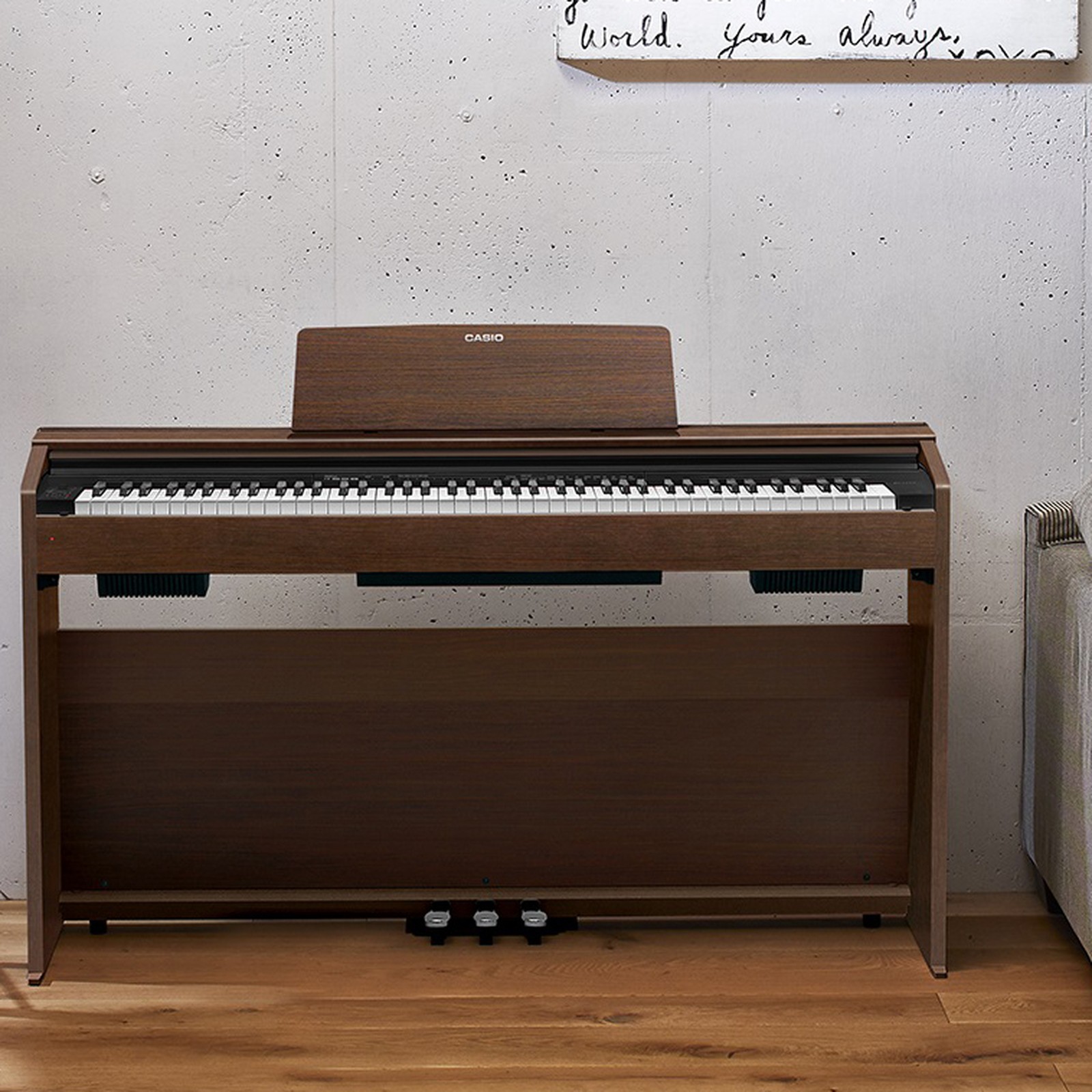 Freunden der Hausmusik bietet das Casio PX-870 BN Privia eine gehobene Klangvielfalt mit Schwerpunkt auf Flügel-und Klaviersounds. Die Ausstattung sorgt für überzeugende Sounds. Drei Pedale sind fest mit dem Unterbau verbunden. Dank der kompakten Maße des braunen Gehäuses mit Holzmaserung von 139,3 cm Breite, 29,9 cm Tiefe und 80,1 cm Höhe passt das Digitalpiano gut in kleine Privaträume. Beim nachbarfreundlichen Üben können Schüler und Lehrer je einen Kopfhörer anschließen. Für Wohnzimmerkonzerte kann in diese Ausgänge ein Verstärker verkabelt werden. Wer einen Computer anschließt, kann auf dem Piano gespielte Songs als MIDI-Daten speichern oder aus dem Computer immer wieder neue Songs in die Musikbibliothek des Pianos laden. Über die Ausstattung des PX-770 Privia hinaus hebt der Lautstärke-Synch-EQ Höhen und Bässe bei niedrig eingestellter Gesamtlautstärke an, um gleichwohl ein voluminöses Klangerlebnis zu bereiten.