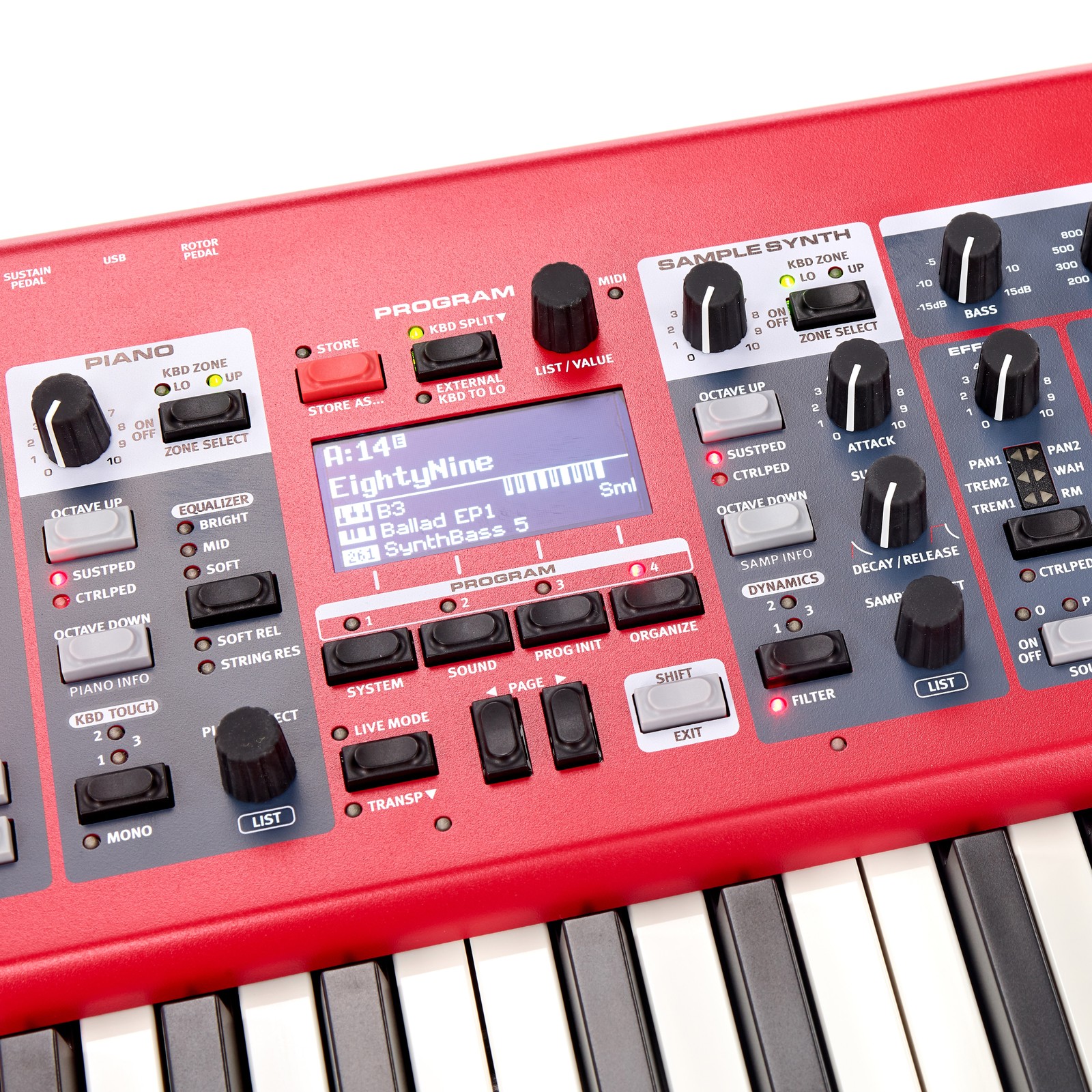 Der Electro richtet sich vor allem an versierte Keyboarder, die ein Faible für Retro-Instrumente haben. Die B3-Klänge mit der Leslie-Emulation sind einfach eine Wucht und die LED-Drawbars sorgen für die entsprechenden Eingriffsmöglichkeiten. Ebenso wie die Klaviere und E-Pianos/Clavinets setzen sie sich auf der Bühne durch und machen jede Menge Spaß. Der Speicher des Sample-Synthesizers wurde aufgestockt und lässt sich mit Klängen aus der umfangreichen Nord-Sample-Library bestücken. Man muss allerdings beachten, dass es keinen Pitchbend und auch kein Modwheel gibt. Das hätte man bei einer Hammond B3 oder einem originalen Fender Rhodes aber auch vergeblich gesucht!