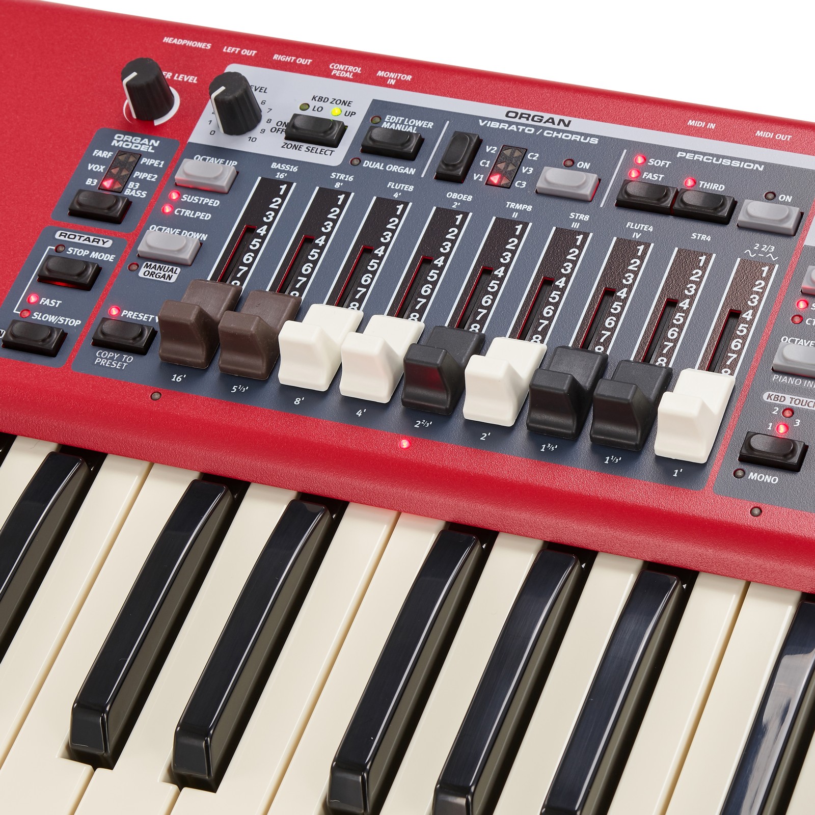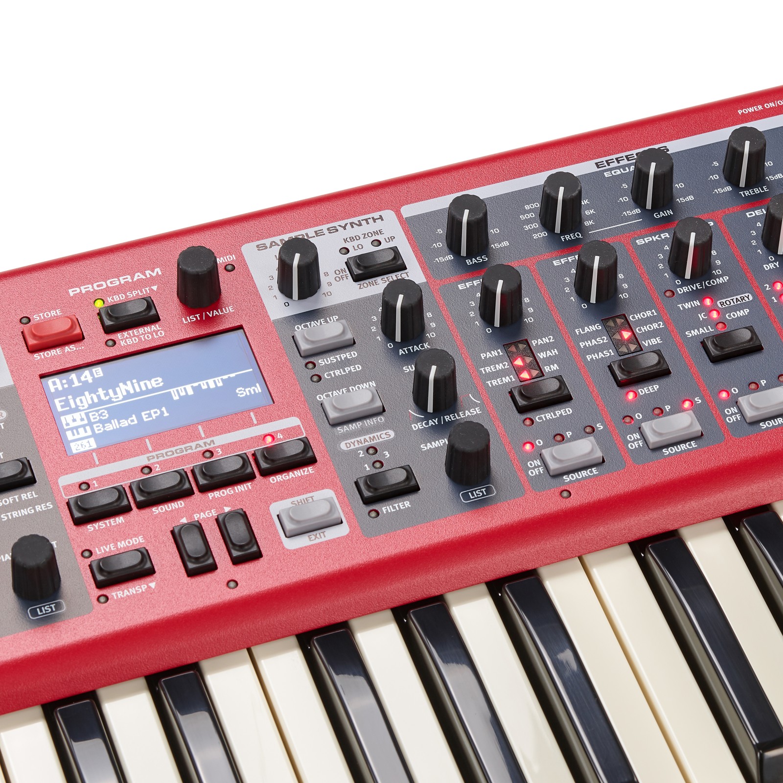 Der Electro richtet sich vor allem an versierte Keyboarder, die ein Faible für Retro-Instrumente haben. Die B3-Klänge mit der Leslie-Emulation sind einfach eine Wucht und die Zugriegel sorgen für die entsprechenden Eingriffsmöglichkeiten. Ebenso wie die Klaviere und E-Pianos/Clavinets setzen sie sich auf der Bühne durch und machen jede Menge Spaß. Der Speicher des Sample-Synthesizers wurde aufgestockt und lässt sich mit Klängen aus der umfangreichen Nord-Sample-Library bestücken. Man muss allerdings beachten, dass es keinen Pitchbend und auch kein Modwheel gibt. Das hätte man bei einer Hammond B3 oder einem originalen Fender Rhodes aber auch vergeblich gesucht!