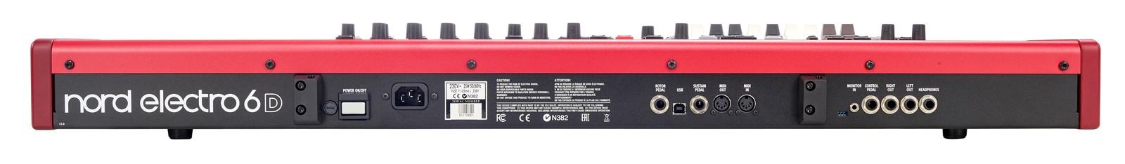 Den Nord Electro 6 gibt es in verschiedenen Ausführungen: mit einer 61er-/73er-Waterfalltastatur (6 D 61/73) und echten Zugriegeln oder als 6 HP mit 73 Tasten Nord Hammer Action Portable (also einer gewichteten Tastatur mit Hammermechanik) und LED-Drawbars. Waterfall bedeutet, dass es sich um halbgewichtete Tasten ohne die für Klaviere typische kleine „Lippe“ am Tastenende handelt. Waterfalltastaturen erlauben es dem geübten Hammondspieler, typische Glissandi mit dem Handballen, dem Ellenbogen oder dem Fingerrücken einzustreuen, um seine Performance aufzupeppen. In diesem Text behandeln wir den Nord Electro 6D 61, wer mehr Pianos als Orgeln spielen möchte, der sollte sich das Modell 6 HP anschauen, obwohl auch mit der halbgewichteten Tastatur erstaunlich authentisches Klavierspiel möglich ist.