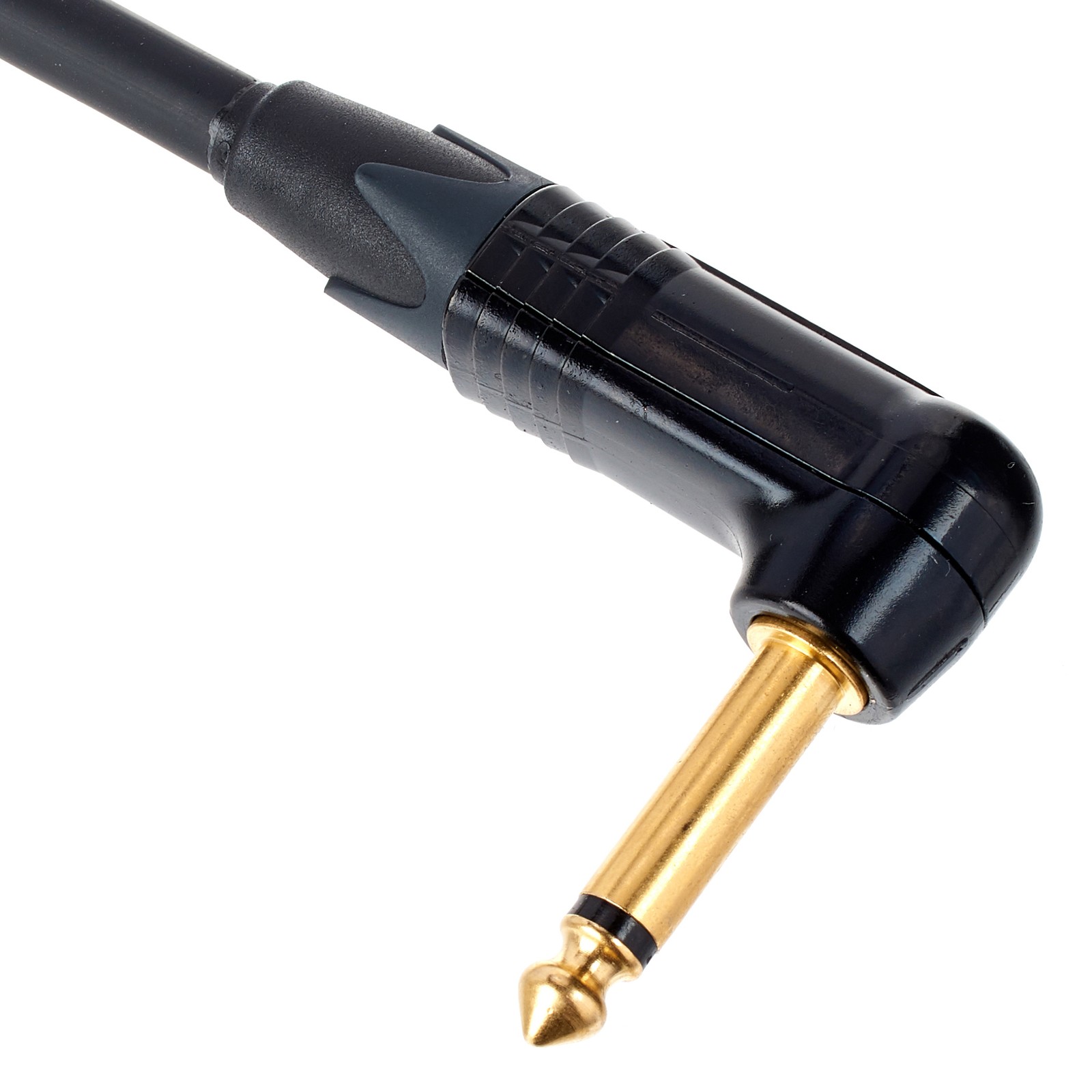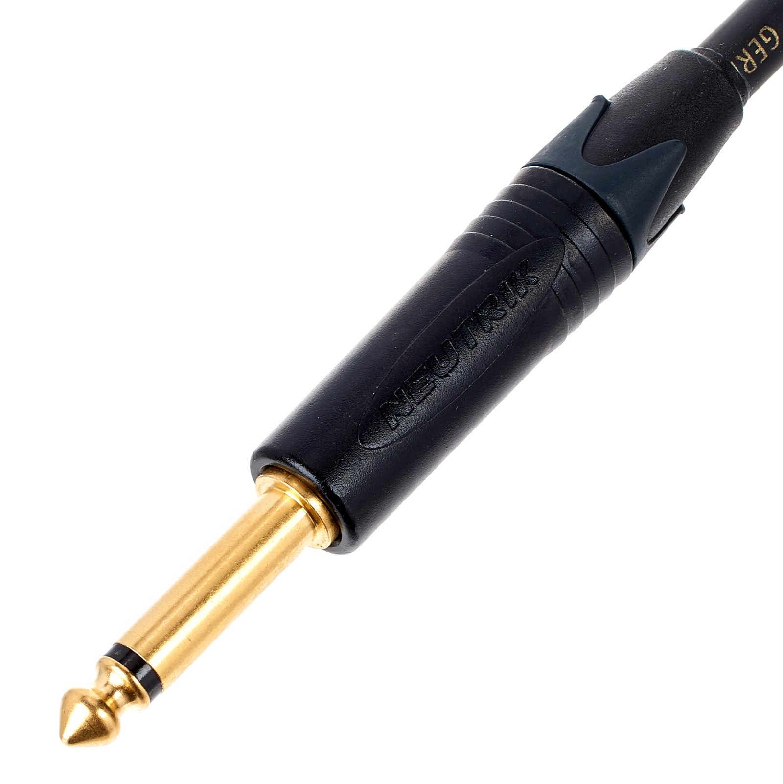 Das Instrumentenkabel CSI 9 PR-Gold basiert auf der hochwertigen Meterware CGK 122 mit einem Leiterquerschnitt von 0,22mm² (AWG 24). Der Leiterquerschnitt ergibt sich aus 7 verzinnten Kupferlitzen (Ø0,22mm) in koaxialer Aderanordnung. Die Kapazität (Leiter/Leiter) liegt bei unglaublichen 82pF/m ± 8%, der Leiterwiderstand bei 87Ohm/km. Eine dreifache Schirmung, bestehend aus einem Geflecht aus blanken Cu-Drähten auf zwei Schirmen leitendem Kunststoff, sorgt für eine störungsfreie und ungetrübte Signalübertragung. Außerdem ist das CSI 9 PR-Gold mit einer geraden Klinke und mit einer Winkelklinke von Neutrik ausgestattet. Beide Stecker verfügen über Goldkontakte zum Schutz vor Korrosion.