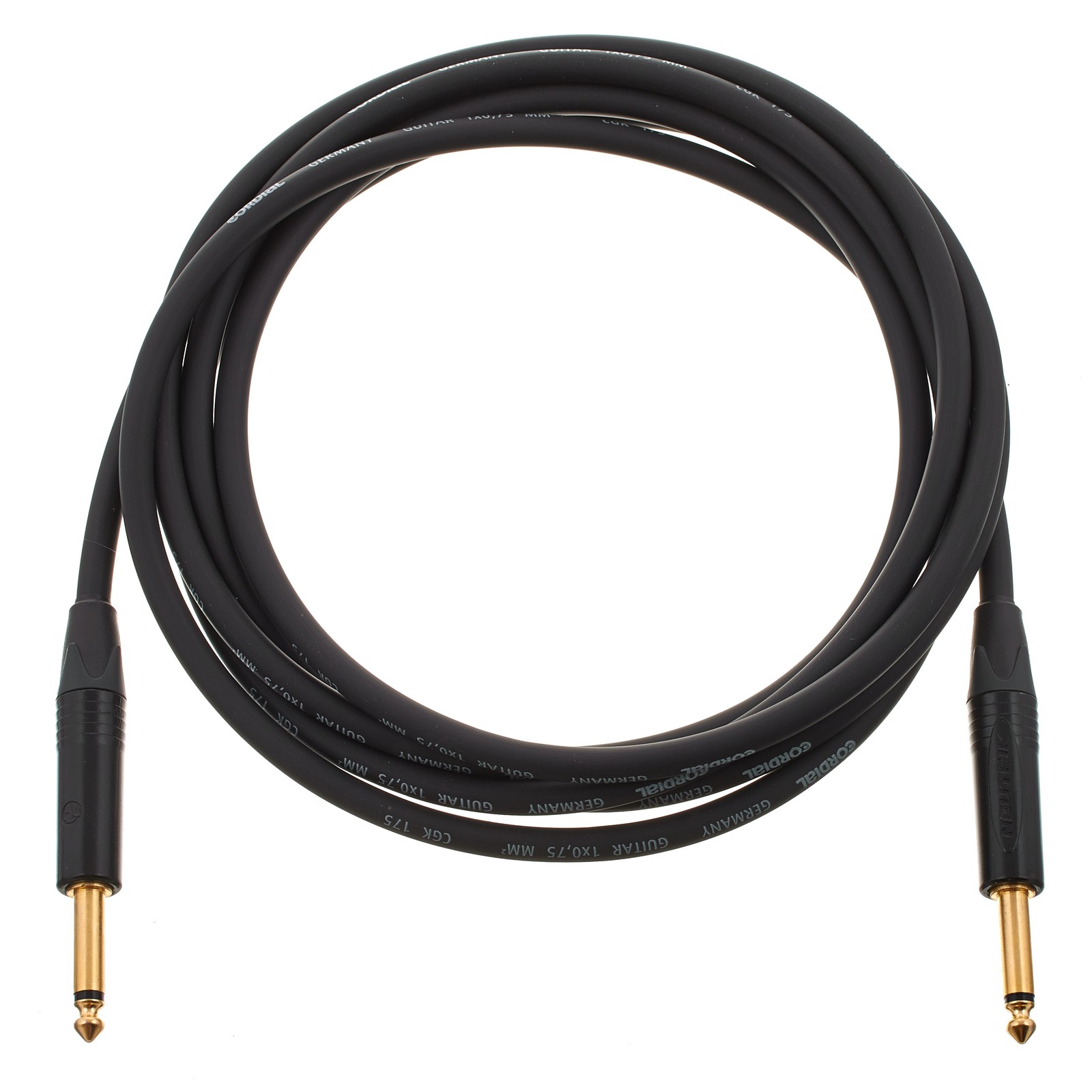 Das Instrumentenkabel CSI 3 PP-175 basiert auf der hochwertigen Meterware CGK 175, die durch ihren großen Leiterquerschnitt von 0,75mm² (AWG 19) überzeugt. Der Leiterquerschnitt ergibt sich aus 42 feinen, hochreinen Kupferlitzen (Ø0,15mm) in koaxialer Aderanordnung. Die Kapazität (Leiter/Leiter) liegt bei 88pF/m, der Leiterwiderstand bei 25.5Ohm/km. Für eine störungsfreie und ungetrübte Signalübertragung wird eine doppelte Schirmung, bestehend aus einem Geflecht aus blanken Cu-Drähten auf leitendem Kunststoff, eingesetzt. Außerdem ist das CSI 3 PP-175 mit zwei geraden Neutrik-Klinkensteckern mit Goldkontakten zum Schutz vor Korrosion ausgestattet.
