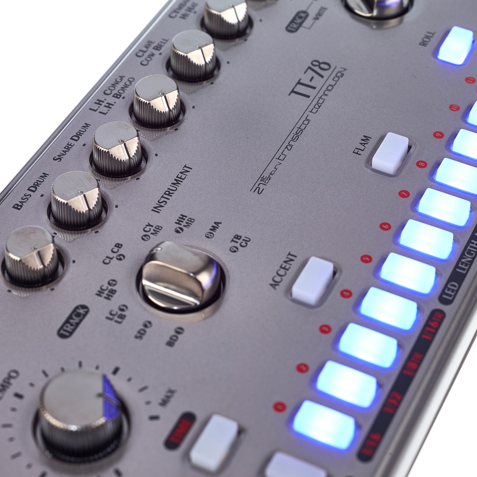 Die Drums der TT-78 werden analog erzeugt und fast alle Sounds können mit einem Tone-Parameter editiert werden. Zur Modulation von Tone ist pro Sound ein synchronisiert laufender LFO vorhanden. Über sieben Ausgänge lassen sich einzelne oder gruppierte Instrumente abgreifen, um sie dann individuell mischen zu können. Der Sequenzer kann Patterns mit maximal 64 Steps erzeugen, während sich mittels Funktionen wie Accent, Flam, Roll und Shuffle Beats für clubtaugliche Tracks programmieren lassen. Über MIDI kann die TT-78 synchronisiert werden. Alle Instrumente lassen sich inklusive Accent triggern und die Soundparameter via Controller-Befehlen steuern. Auf diese Weise kann die Maschine auch als Expander fungieren.