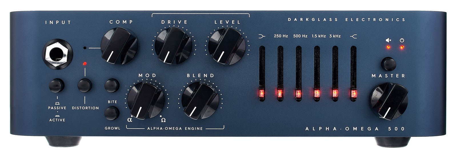 Mit dem Alpha Omega 500 präsentiert die finnische Company Darkglass eine leicht abgespeckte und preisgünstigere Version ihres populären Alpha Omega 900. Eine analoge Vorstufe bildet gepaart mit der neuen, im eigenen Hause entwickelten und 500W starken Class-D-Endstufe die Basis dieses Amps. Der sechsbandige grafische Equalizer erlaubt die exakte Anpassung des Sounds an die eigenen Bedürfnisse. Zudem bietet der Alpha Omega 500 in Sachen Anschlussperipherie eine zeitgemäße Ausstattung. Das allein wären eigentlich schon Features genug, doch der Clou des Geräts kommt erst noch: Darkglass' erfolgreiche Alpha-Omega-Verzerrung lässt sich inklusive umfangreicher Einstellmöglichkeiten per Knopfdruck bzw. Fußschalter hinzuschalten. Ein für Bass optimierter Kompressor ist ebenfalls mit an Bord. Beide Effekte sind keine bloße Dreingabe, sondern sie basieren auf Darkglass' professionellen und renommierten Pedals.