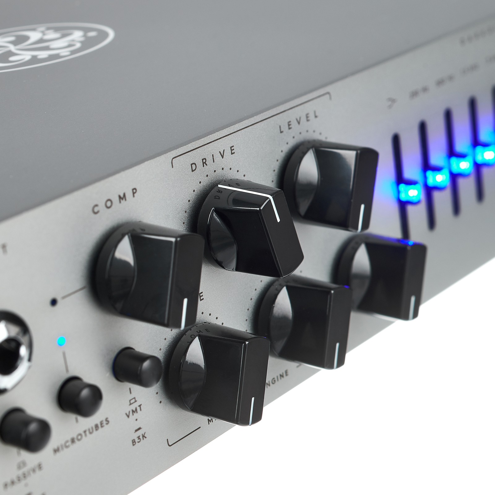 Die finnische Company Darkglass bietet mit dem Microtubes 900 in der zweiten Version einen flexiblen und leistungsstarken Bassamp in einem kompakten und leichten Format. Eine analoge Vorstufe, gepaart mit einer kraftvollen Class-D Endstufe, welche bis zu 900 Watt liefert, bilden die Basis dieses Amps. Der 6-bandige grafische Equalizer erlaubt die exakte Anpassung des Sounds an die eigenen Bedürfnisse, und zudem glänzt der Microtubes 900 V2 in Sachen Anschlussperipherie mit luxuriöser Ausstattung. Das wären eigentlich schon Features genug, der Clou kommt aber noch: Per Knopfdruck bzw. Fußschalter lässt sich Darkglass proprietärer Microtubes Effekt (wahlweise Overdrive oder Distortion) inklusive umfangreicher Einstellmöglichkeiten hinzu schalten, und auch ein für Bass optimierter Kompressor ist mit an Bord. Beide Effekte sind keine bloße Dreingabe, sondern basieren auf Darkglass' professionellen und renommierten Pedalen.