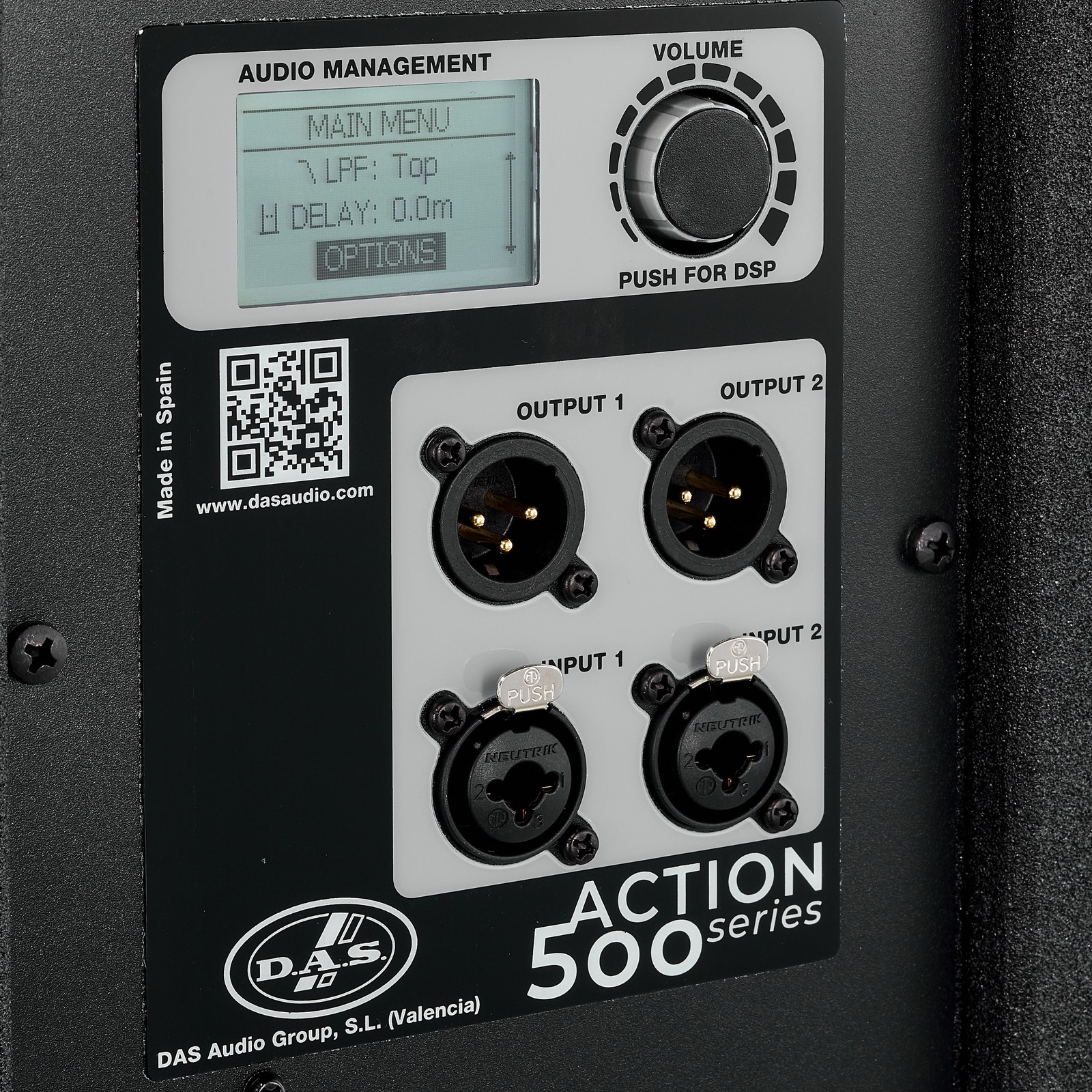 In den Lautsprechern des DAS Audio Action 512/S18A Power Bundles arbeiten Class-D-Endstufen. Sie werden von 24-Bit DSPs gesteuert, die auch Funktionen wie unterschiedliche Voicing-Presets, Tief- und Hochpassfilter und eine Verzögerung für den Delay-Stack-Betrieb bieten. Je zwei Combobuchsen bilden die Mic-/Line-Eingänge der Speaker. Die dazu gehörenden XLR-Buchsen sind symmetrisch geschaltet und haben eine Impedanz von 20kOhm. Über zwei XLR-Anschlüsse wird das unbearbeitete Eingangssignal an die Fullrange-Speaker weitergereicht, sodass mit ihnen ein 2.1-System entsteht. Dem professionellen Anspruch entsprechen auch die Netzanschlüsse per PowerCon-Buchse. Außerdem steht an den Fullrange-Lautsprechern je eine 3,5mm-Klinkenbuchse als Aux-Eingang bereit.
