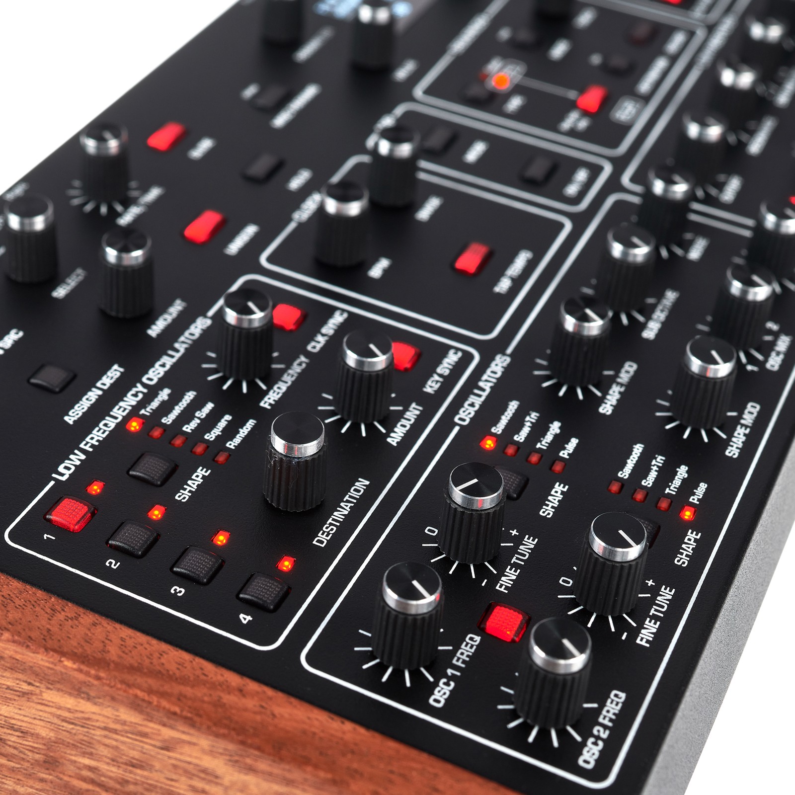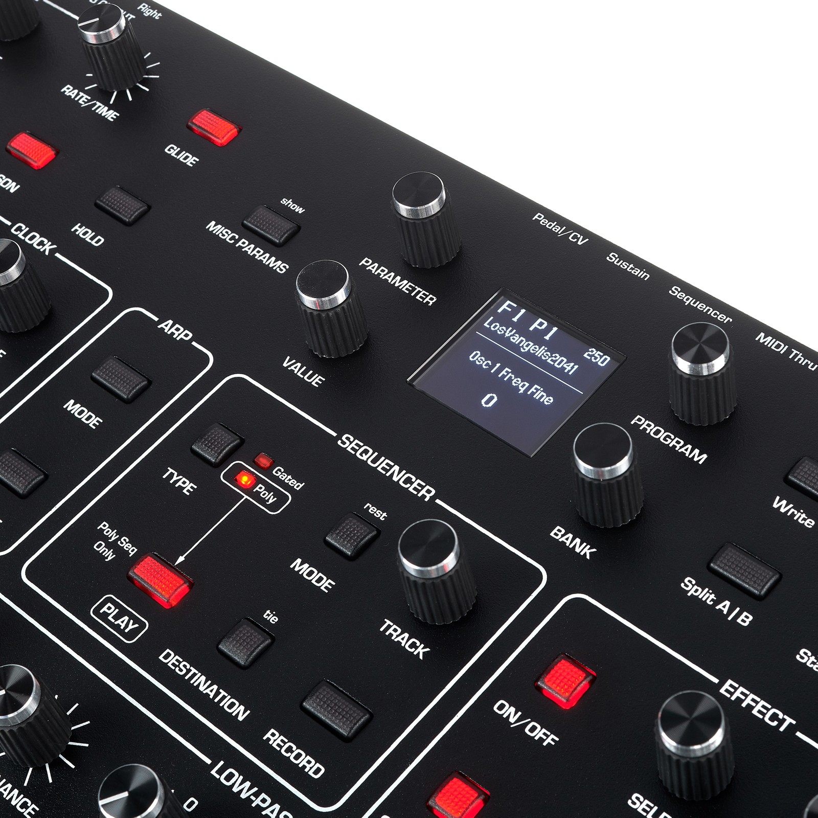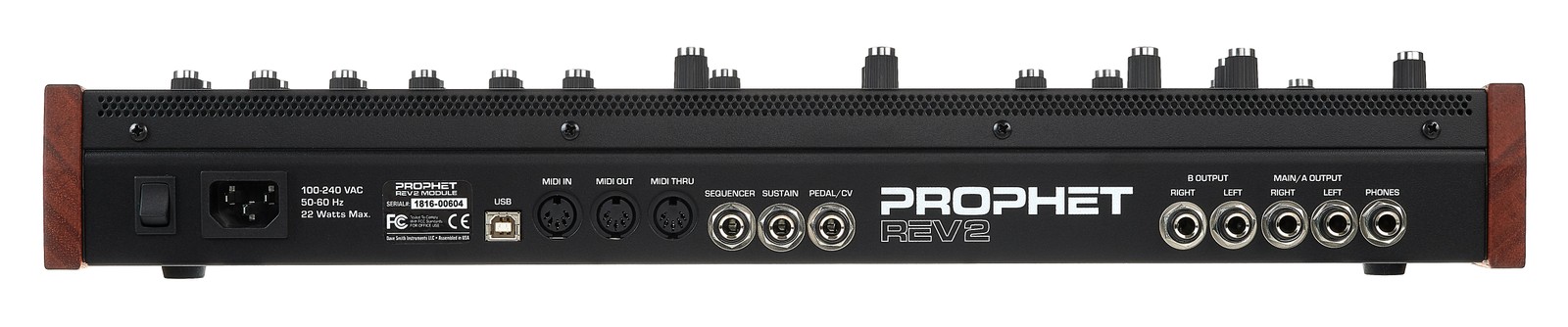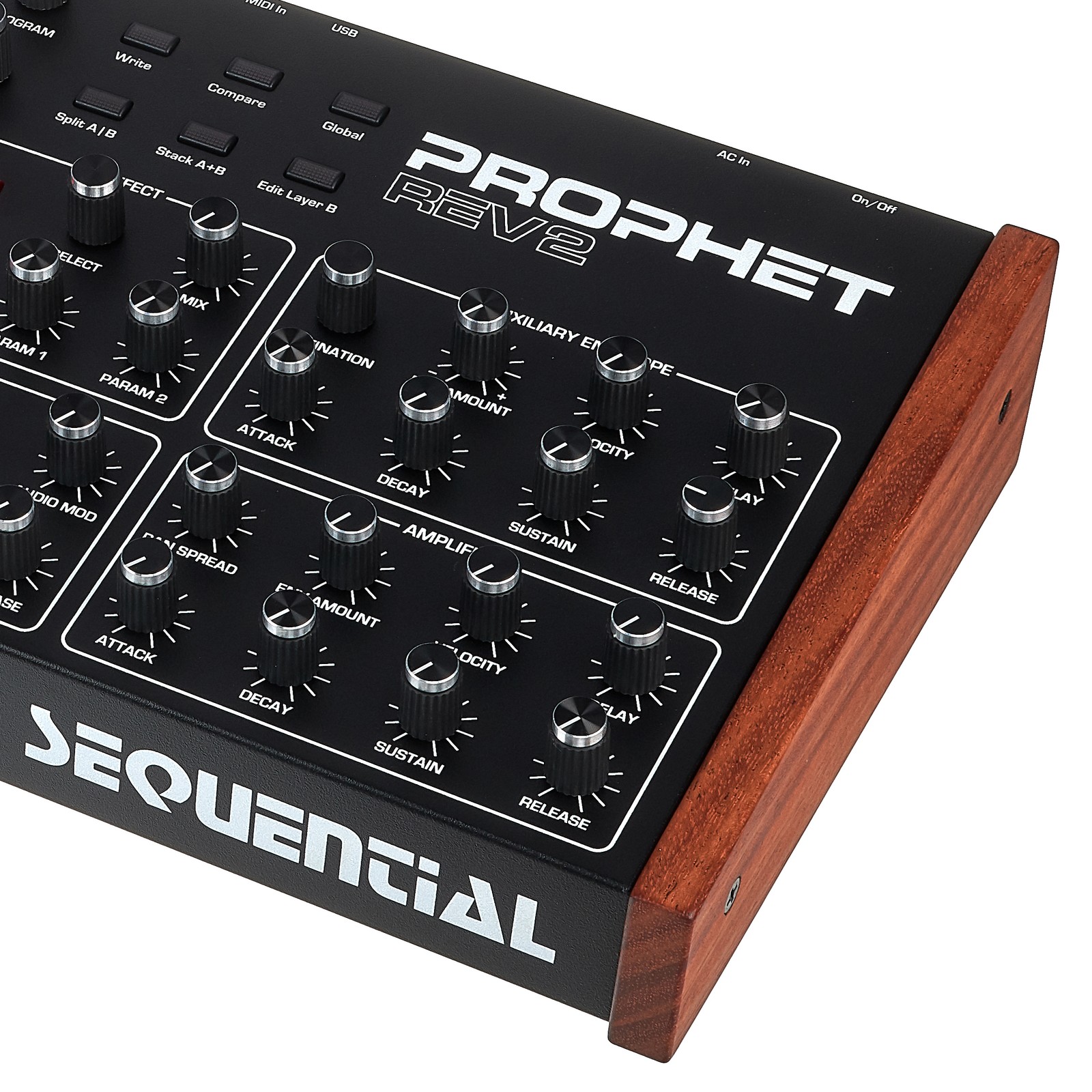 Der Prophet REV2 verfügt wie der Prophet 08 über zwei digital gesteuerte Oszillatoren pro Stimme, die legendären Curtis-Filter und VCAs. Auch Sounds des Prophet 08 können geladen werden und klingen wie beim Vorgängermodell. Neu sind unter anderem das helle OLED-Display, eine erweiterte Mod-Matrix, die digitale Effektsektion, eine USB-Schnittstelle und der zusätzliche, 6-stimmig polyfone Step-Sequencer. Neben 512 Presets gibt es 512 User-Programme mit zwei Layern, die natürlich auch gesplittet werden können - etwa für einen Bass in der linken und eine Fläche in der rechten Hand. Auch zum Sequencer kann je nach Stimmenzahl zusätzlich gespielt werden.