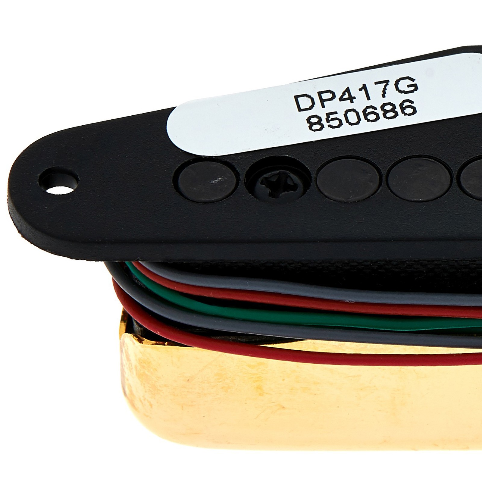 Der DiMarzio Area T Neck DP417 ist ein Tonabnehmer, der für die Halsposition der Fender Telecaster konzipiert ist. Im Gegensatz zu den Originalen besteht er jedoch aus zwei Spulen, die nicht, wie bei einem herkömmlichen Humbucker, nebeneinander, sondern übereinander positioniert sind. „Stacked“ wird das genannt, gestapelt also. Das im Vergleich zum Humbucker schmale Magnetfeld legt schon mal eine gute Grundlage für einen Single-Coil-ähnlichen Sound. DiMarzio hat dieses Verfahren derart gut im Griff, dass sogar die Charakteristik bestimmter Jahrgänge modelliert werden kann. Einen schönen Nebeneffekt hat die Sache außerdem: Die Metallkappe klaut auch in Gold-Optik keinen Sound! Beide Spulen werden übrigens mit einem vieradrigen Kabel separat nach außen geführt, sodass man, wenn man unbedingt will, mit den unterschiedlichen Kombinationen experimentieren kann.