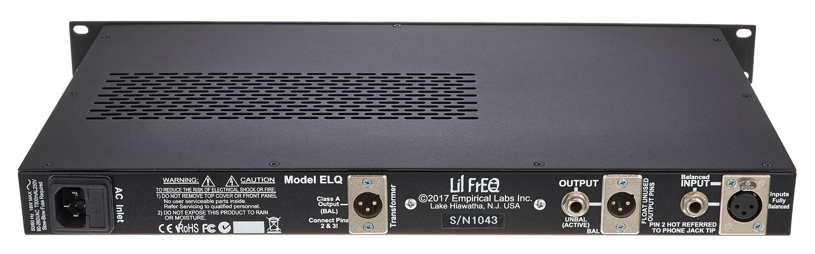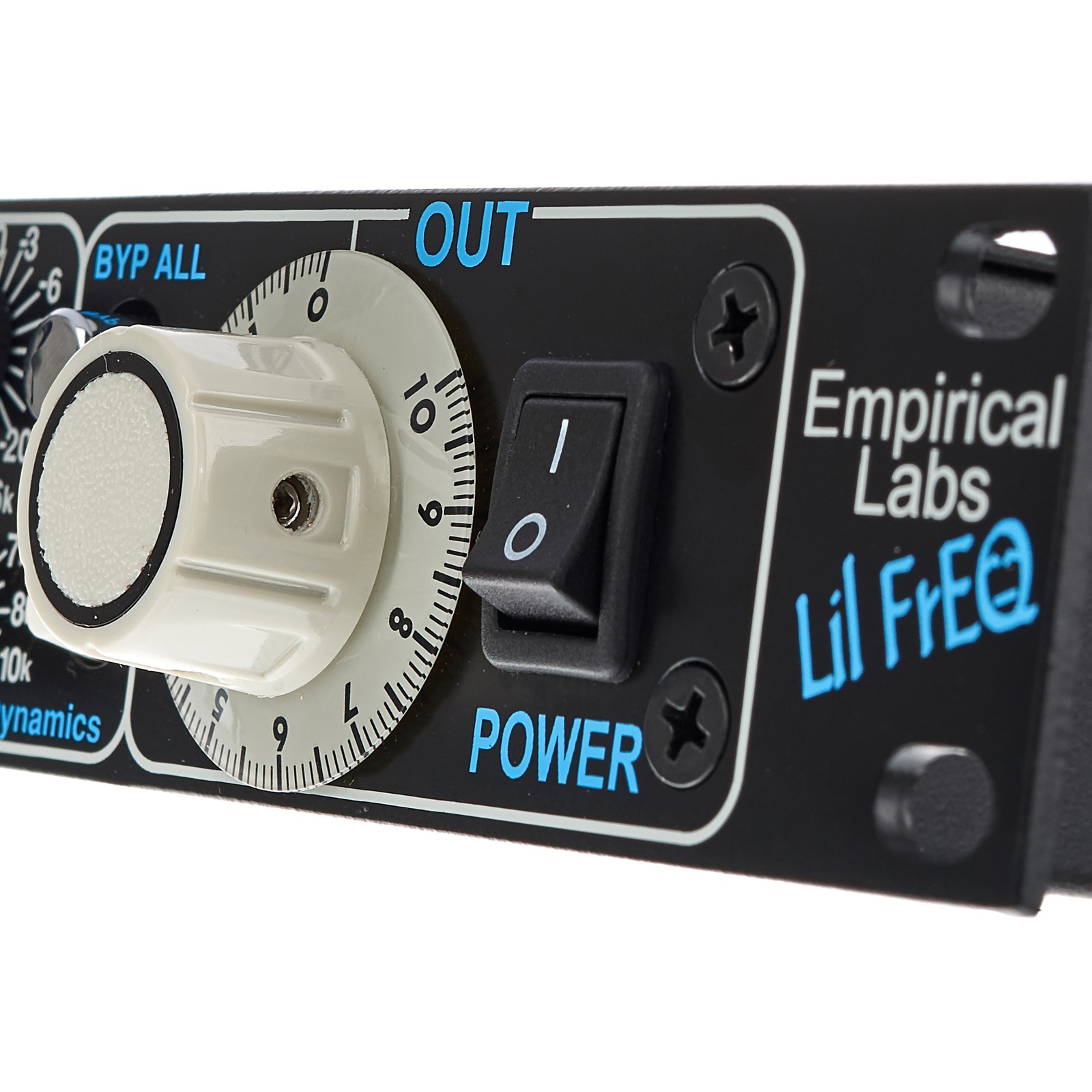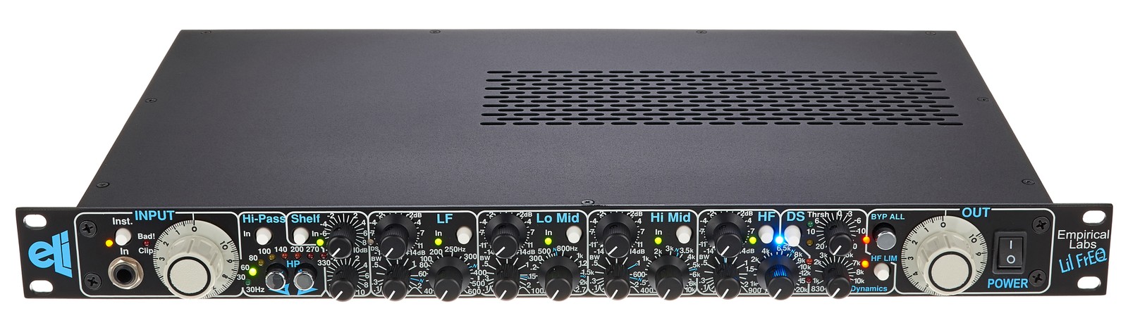 Der Empirical Labs El-Q Lil FrEQ ist ein einkanaliger Equalizer im 19-Zoll-Format mit vier vollparametrischen Mittenbändern, einem Lowcut- und zwei Shelving-Filtern sowie einem dynamischen Höhenband. Das alleine ist schon mächtig viel Ausstattung, aber Dave Derr (Gründer und Entwickler von Empirical Labs) genügt das nicht! Und so bastelt er uns weitere Besonderheiten unter die Haube: Zum Beispiel einen DI-Eingang für hochohmige Instrumente – bei einem EQ! Und einen trafobasierten Ausgang, gewickelt nach Neve-Spezifikationen, für den echten Vintage-Analogsound. Dazu passend: Markierungen in den vier EQ-Bändern, welche die Schalterpositionen eines Neve-1073-EQs anzeigen. Und das dynamische DS-Höhenband basiert auf dem DerrEsser, Empirical Labs hochgelobten „High Frequency Fixer“.
