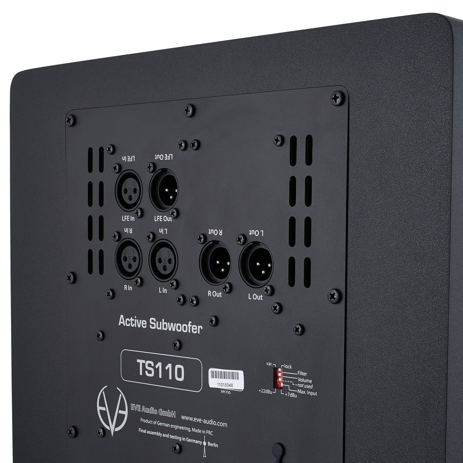 Mit seinen umfassenden XLR-Ein- und Ausgängen ist der TS110-Subwoofer die perfekte Ergänzung für EVE Audios 2-, 3- und 4-Wege-Studiomonitore aus der SilverCone-Serie. Seine leistungsstarke Wiedergabe erweitert den Tiefbassbereich bereits bestehender Stereosysteme bis 28Hz. Dabei sorgen die DSP-Filter sowie die IR-Fernbedienung für eine einfache Einrichtung. Für das Arbeiten ohne Bassunterstützung lassen sich Subwoofer und DSP-Filter mit der „PureSatellite“-Funktion ganz bequem umgehen. Alternativ zu einer Integration in ein Stereosystem mit fest angeschlossenen Satelliten kann der TS110 ebenso in einem Mehrkanalsystem als LFE genutzt werden.
