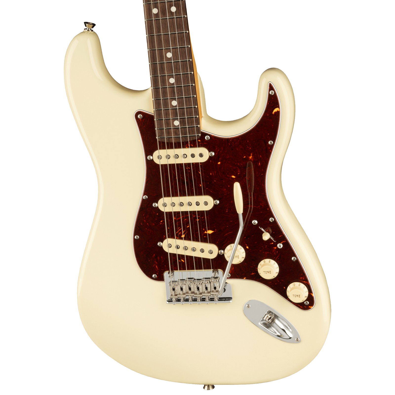 Bei den drei Single-Coils der Fender AM Pro II Strat OWT handelt es sich um ein V-Mod II Stratocaster Pickup-Set. Es besteht aus unterschiedlichen AlNiCo-Tonabnehmern (siehe Abschnitt "Im Detail erklärt" weiter unten), die speziell abgestimmt für ihre jeweilige Position ausgewählt wurden und einen klassischen Vintage-Strat-Ton ausgeben. Ein 5-Wege-Schalter sorgt für verschiedene Pickup-Kombinationen. Außerdem hat der zweite Tone-Regler eine Push/Pull-Funktion. Durch sie lässt sich der Hals-Pickup auch mit dem Steg-Pickup und sogar mit beiden anderen Pickups kombinieren. Das schafft Möglichkeiten für erweiterte Klangfarben. Gegenüber einer Standard-Strat sorgen gleich drei Features für ein noch besseres Spielgefühl. So ist der Übergang des verschraubten Halses bei diesem Modell praktischerweise abgerundet. Nicht zuletzt sind die Kanten des Griffbretts von Hand abgerundet, sodass das Spielen angenehm von der Hand geht und Spaß macht.