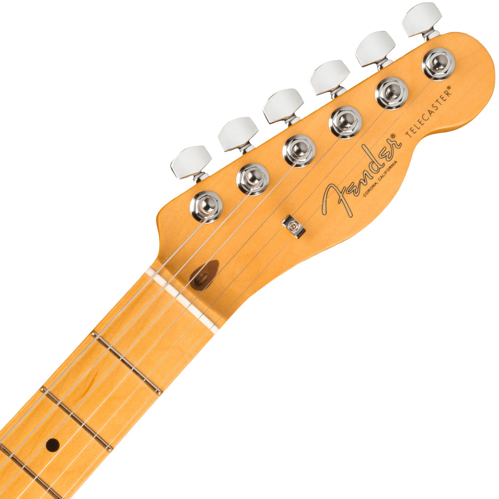 Bei den Pickups der AM Pro II Tele MN BTB handelt es sich um ein V-Mod II Set mit abgestimmten Single Coils für die Hals- und Stegposition. Telecasterüblich werden die PUs mit einem Drei-Wege-Schalter angewählt. Beim Volume-Poti handelt es sich um ein Push/Pull-Poti, mit dem die Pickups in Reihe geschaltet werden können. So sind auch druckvolle Rocksounds möglich, was für eine Tele mit Single Coils eher unüblich ist. Die Telecaster Deluxe Bridge besitzt kompensierte Messingsaitenreiter, die die Intonation der Saiten deutlich verbessern. Die Saiten können durch die Bridge (Top Load) oder durch den Korpus (String-Thru) aufgezogen werden. Die abgerundete Griffbrettkante kommt denjenigen Gitarristen entgegen, die gerne mit dem Daumen über dem Griffbrett spielen. Der abgerundete Hals-Korpus-Übergang erleichtert das Spielen in den hohen Lagen.