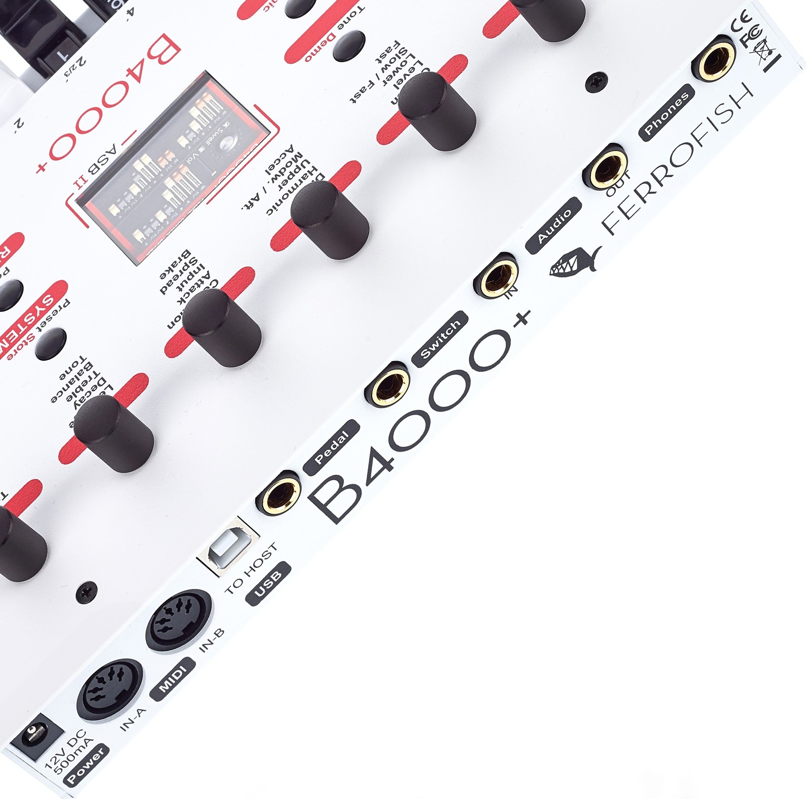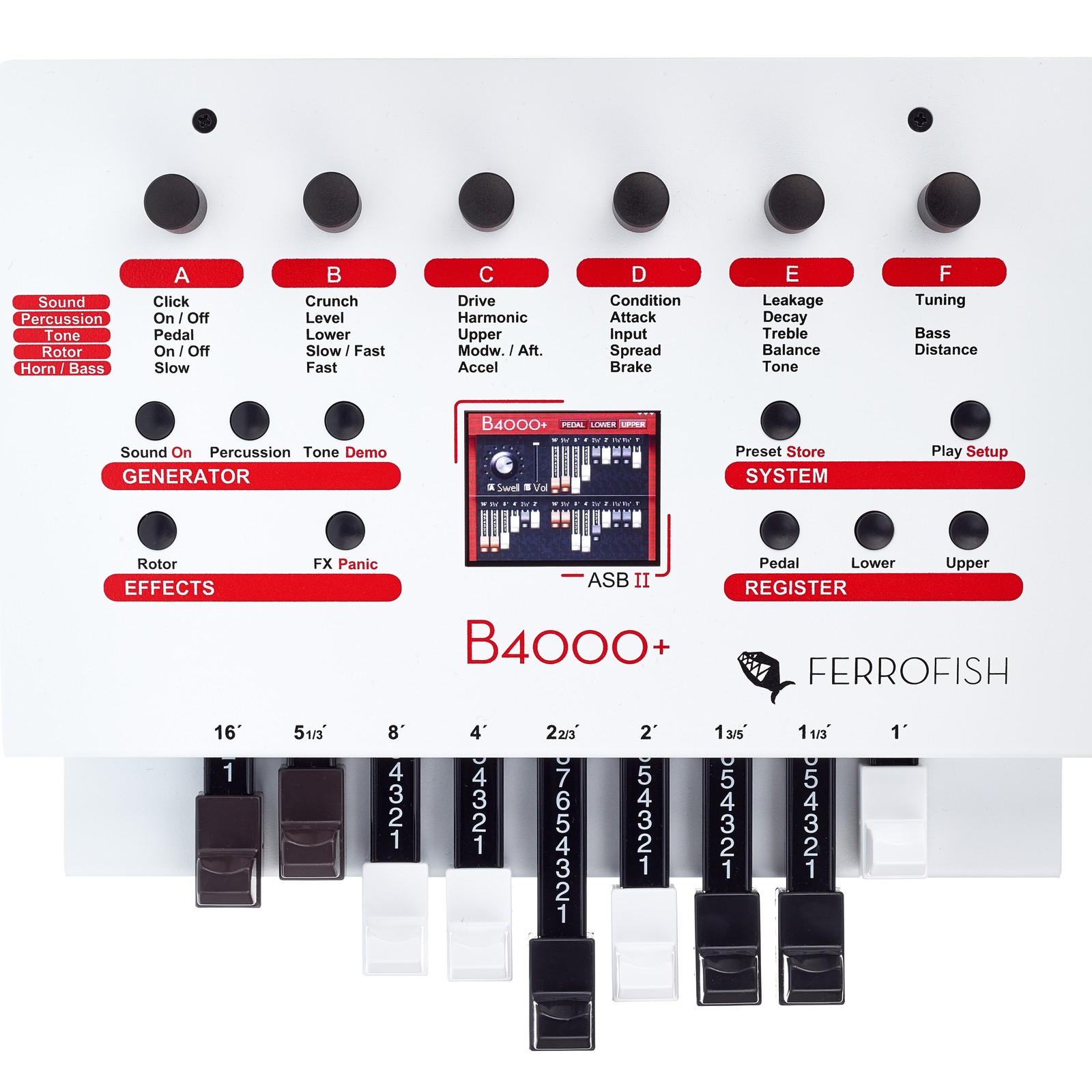 Mit dem B4000+ bietet Ferrofish den klassischen Hammond-B3-Sound im Taschenformat als Erweiterung fürs Keyboard. Der Expander dient als Ersatz für eine komplette Orgel, somit können Ober- und Untermanual sowie auch Pedals mit ihm betrieben werden. Ausgestattet ist er mit einem gerasterten, neunchörigen Zügelsystem mit jeweils acht Lautstärkestufen. Das System ist wie gewohnt zweifarbig angeordnet, und man erreicht mit ihm ein authentisches Spielgefühl. Die Zugriegel steuern standardmäßig das obere Manual. Der farbige TFT-Bildschirm bietet in Kombination mit den sechs stufenlosen Drehreglern A bis F eine übersichtliche Bedienung der Einstellungen und ermöglicht das Zuschalten von Effekten. Zahlreiche Presets sorgen für Voreinstellungen, mit denen der gewünschte Klang schnell gefunden ist. Durch das Vornehmen der Einstellungen sowie das Zuschalten des integrierten Leslie-Effektprozessors und des Nachhalls wird der Klang des B4000+ aber erst so richtig lebendig.