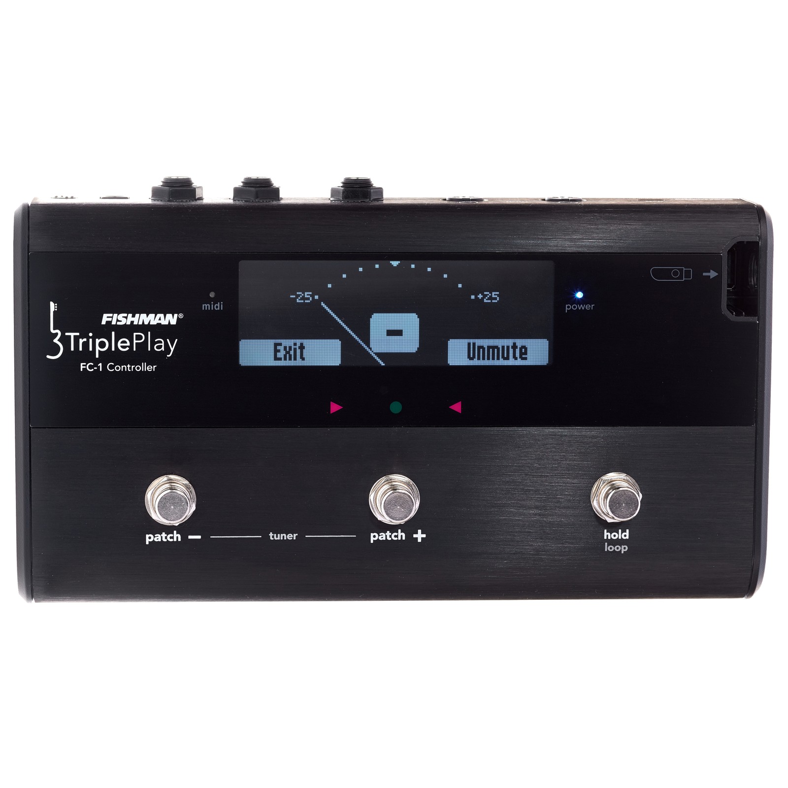 Der Fishman FC1 Foot Controller ermöglicht es, die MIDI-Signale des Triple Play Pickups ohne den Einsatz eines Computers an einen Klangerzeuger abzugeben und individuelle Controller-Daten beispielsweise zum Umschalten von Patches an die verbundenen MIDI-Geräte zu senden. Außerdem kann ein zusätzlich angeschlossenes und frei konfigurierbares Expression-Pedal weitere Aufgaben übernehmen. Das große und beleuchtete Display garantiert dabei stets einen guten Überblick über den aktuellen Status, sodass selbst in den dunkelsten Ecken der Bühne kein Blindflug herrscht. Weitere Extras, wie etwa die integrierte Stimmfunktion oder die Batteriestatusanzeige des Triple Play USB-Empfängers, sorgen zusätzlich für Sicherheit beim Einsatz des Fishman FC1 im oftmals hektischen Bühnenbetrieb.