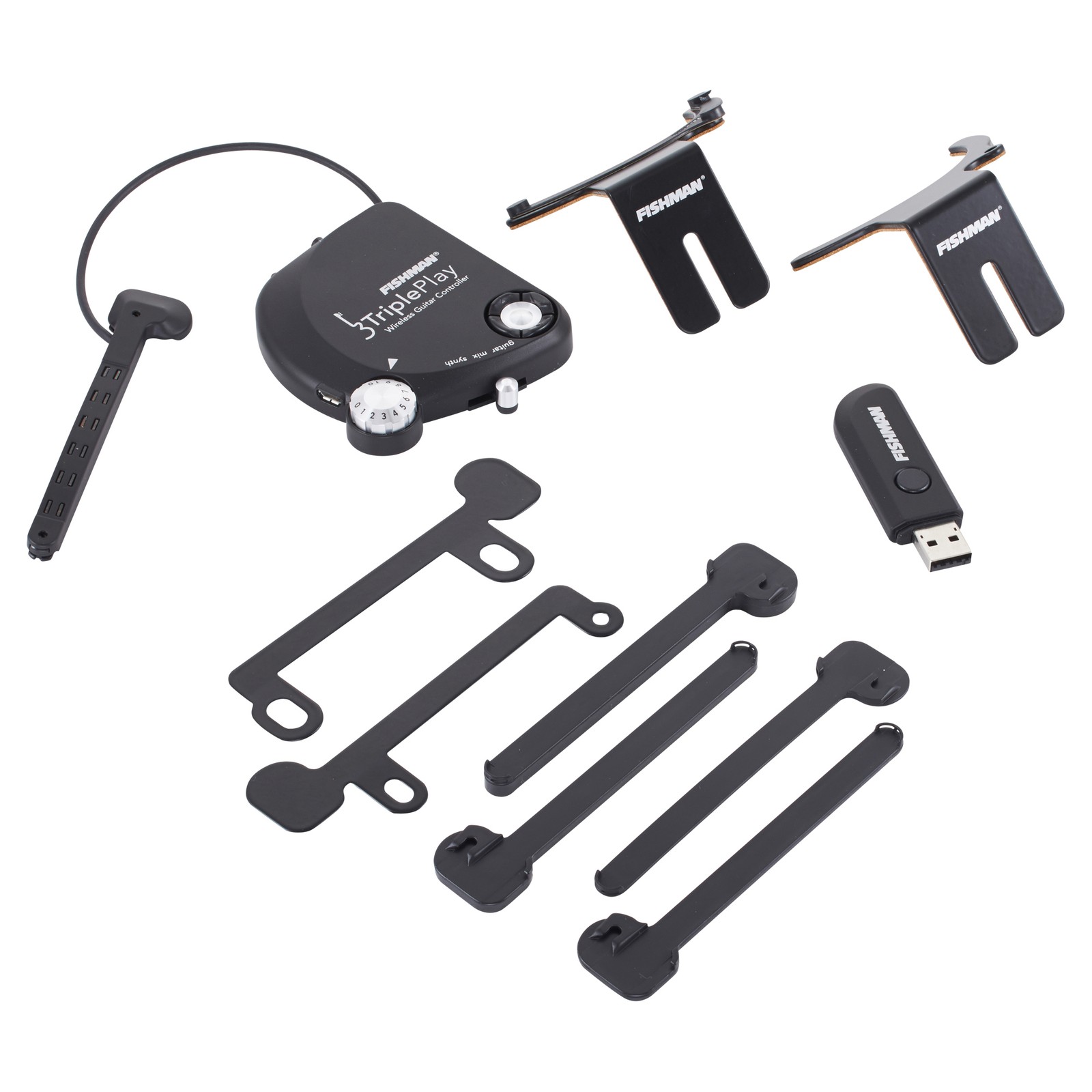 Mit dem Fishman Triple Play erhalten Profis ein wirkungsvolles Werkzeug an die Hand, das die eigenen Ausdrucksmöglichkeiten enorm erweitert und ganz neue, ungeahnte Möglichkeiten bietet. Einmal auf der Oberseite des Instruments installiert, lassen sich Sounds von Synthesizern spielen, die Notationssoftware ansteuern oder Funktionen innerhalb der Recording-Software ansprechen. Die latenzfreie und kabellose Übertragung mittels USB-Empfänger sorgt für ein Gefühl der Freiheit ohne Kabelwirrwarr auf der Bühne oder im Studio. Mit dem mitgelieferten Software-Bundle kann das Triple Play System frei nach den eigenen Anforderungen und Wünschen konfiguriert werden.