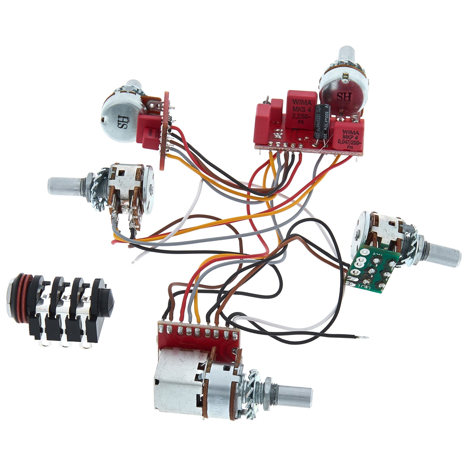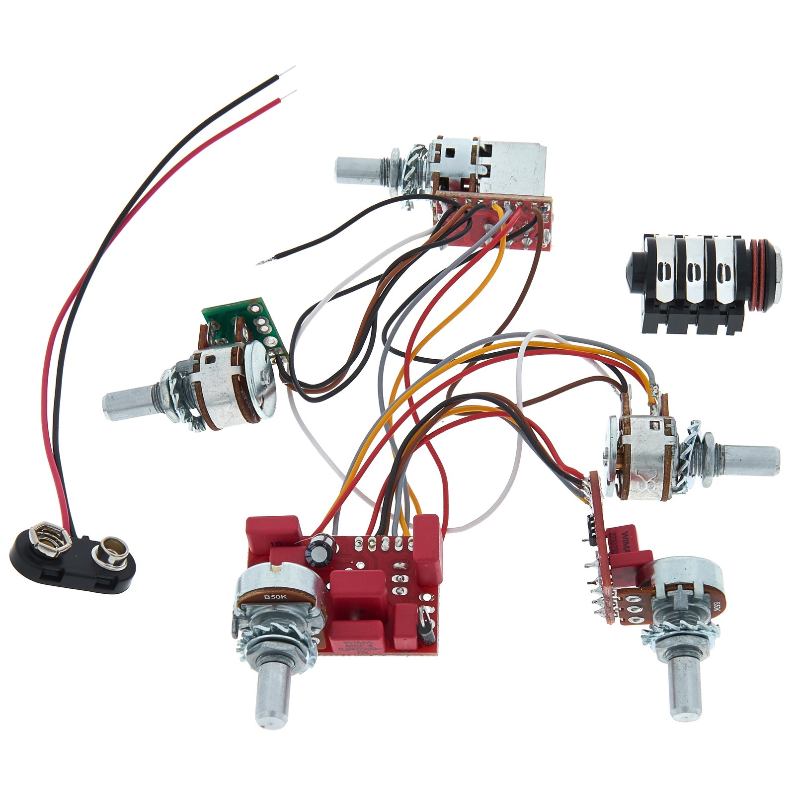 Glockenklangs 3-Band Elektronik kommt komplett fertig verdrahtet mit fünf Potis: Volume, Balance, Bässe, Mitten und Höhen. Der Einbau ist dank hochflexibler Kabel auch bei beengten Verhältnissen kein Problem. Die Push-Pull-Funktion des Volumepotis ermöglicht den Wechsel zwischen aktivem und passivem Modus. In Letzterem wird der Höhenregler zur passiven Tonblende. Auf diese Weise hat man wirklich „Best Of Both Worlds“: moderne, spritzige „aktive“ Sounds und klassische „passive“ Vintage-Klänge. Die von Glockenklang mit Bedacht gewählte Einsatzfrequenz des Bassreglers liegt bei 40Hz (+/-14dB), die des Mittenreglers bei 550Hz (+/-9dB) und die des Höhenreglers bei 4KHz (+/-18dB). Ein großer Vorteil aktiver Elektroniken ist die Impedanzwandlung des hochohmigen Signals der Tonabnehmer in ein niederohmiges. So entstehen auch auf längeren Kabelwegen keine Klangverluste.