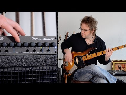 Das Kraftwerk des Steamhammer ist eine 700 Watt starke Class-D-Endstufe. Klangliches Herzstück ist die hochwertige Vorstufe, die in aufwendiger Class-A Schaltung ausgeführt ist. Nach dem Gain-Regler für die Eingangslautstärke folgt eine schaltbare Drive-Sektion, dessen Verzerrung sowohl in Intensität, Mischungsverhältnis und Charakter einstellbar ist. Danach lädt der 4-Band-Equalizer, der sich ebenfalls an- oder ausschalten lässt, zum Individualisieren des Sounds ein. Besonderheit ist hier, dass man bei beiden Mittenbändern per Knopfdruck zwischen zwei unterschiedlichen Einsatzfrequenzen wählen kann. Auch die Konnektivität lässt keine Wünsche offen: Schaltbarer Effektloop (optional mit Fußschalter), Tuner Out, Kopfhörerausgang, hochwertiger D.I. Out, usw.. Das komplette Paket kommt in äußerst transportfreundlichen Maßen von 32x26x6,2cm und einem Gewicht von etwas über 3kg.