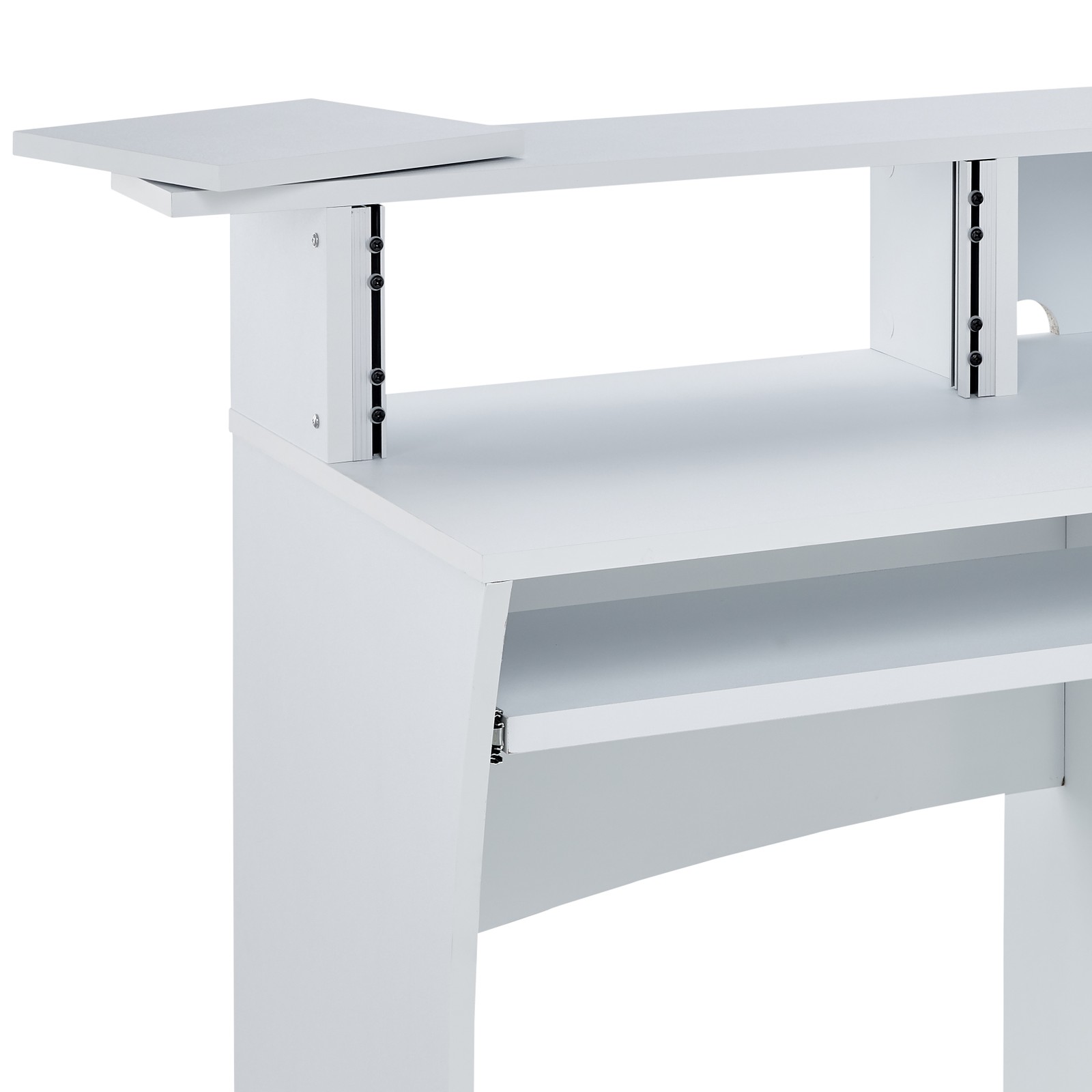 Die erhöhte Plattform ist zuzüglich der Lautsprecherablagen 156 cm breit und bietet ausreichend Platz für zwei Bildschirme. Auf den Lautsprecherablageflächen mit 261 x 261mm können kleinere 2-Wege-Systeme aufgestellt werden. Ferner sind sie drehbar, sodass die Ausrichtung der Lautsprecher wesentlich vereinfacht wird. Die darunterliegenden 19“-Racks sind von der Abhörposition aus leicht zu erreichen, wodurch die eingebaute Hardware komfortabel zu bedienen ist. Außerdem befindet sich zwischen den Racks ein Fach für beispielsweise CDs oder DVDs. Ansonsten können auf der Arbeitsplatte zusätzlich zum Computerzubehör auch weitere Controller, ein Tischmikrofon oder ein kleiner Mixer untergebracht werden.