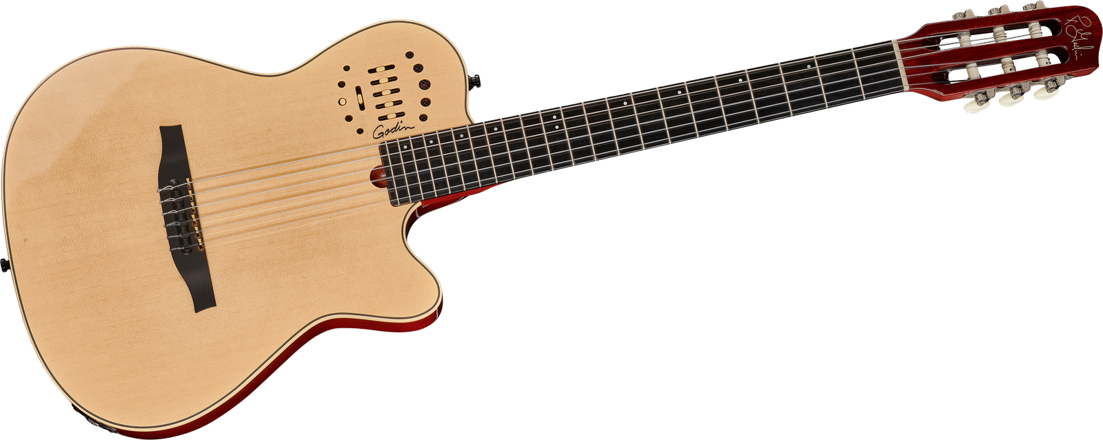 Seit ihrer Präsentation zu Beginn der 90er-Jahre zählt die Godin Multiac zu den beliebtesten elektroakustischen Gitarren überhaupt. Drei Dekaden später präsentiert der kanadische Hersteller mit der Godin Multiac Nylon Deluxe ein Update ihres Zugpferds, das mit seinem neuen Tonabnehmersystem von L.R. Baggs den elektrischen Sound der Gitarre mit sechs individuellen Piezo-Pickups im Steg sowie einem Lyric-Mic im Innern des Korpus noch naturgetreuer erzeugt. Neu ist auch der 2-fach gekammerte Mahagonikorpus, der sich nicht nur positiv auf das Klangverhalten, sondern auch auf das Gewicht auswirkt. Geblieben sind natürlich auch beim neuen Modell die hochwertige Verarbeitung aus handselektierten Hölzern, der charaktervolle Klang und die berühmte famose Bespielbarkeit vom ersten bis hinauf zum letzten Bund.
