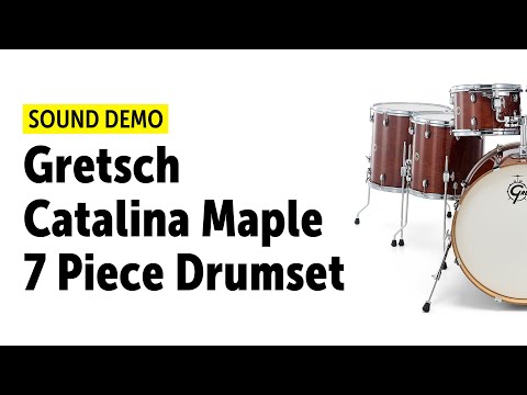 Die Catalina Maple Serie ist die kostengünstigste Möglichkeit, an ein Maple-Set von Gretsch zu kommen. Der Hersteller mit dem großen Namen verbindet hier seine bewährten Prinzipien der Kesselherstellung mit einem modernen und schlanken Hardware-Design. Alle Kessel sind aus siebenlagigem Ahorn gefertigt und verfügen über die für Gretsch typische 30°-Gratung. Klanglich bietet das Kit grundsätzlich einen knackig-fokussierten Sound mit Allrounder-Qualitäten. Die hier angebotene Studio-Konfiguration besteht aus einer 20“x16“ Bassdrum, einer 14“x5,5“ Snare und drei Toms in 10“x07“, 12“08“ und 14“x14“.