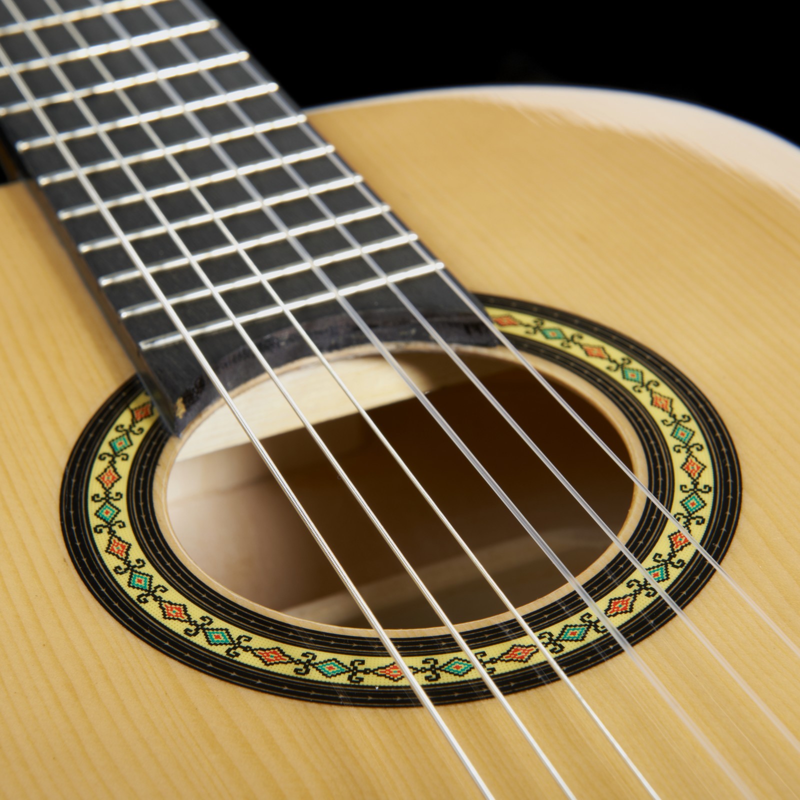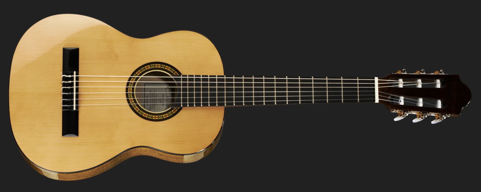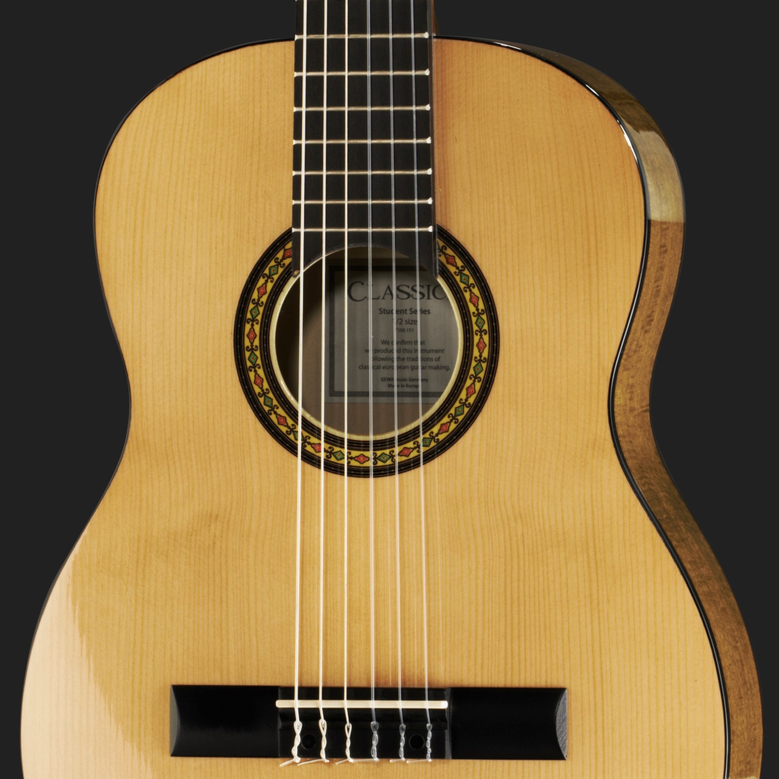 Die Thomann Classic 1/2, die zu dem Bundle gehört, ist eine Gitarre, die sich an die bewährte Vorlage hält. Der Korpus dieses in Europa gebauten Instruments besteht aus laminierter Buche, die Decke aus laminierter und getönter Fichte. Für den Hals wird Ahorn verbaut. Das Griffbrett ist mit 45 Millimetern schmaler als das einer normalen Klassikgitarre, und auch die Mensur fällt mit 53 Zentimetern deutlich kürzer aus. Auch die wichtigsten Zubehörteile sind dabei: Tasche, Stimmgerät, Gitarrenständer sowie ein Notenständer. Damit ist alles im Set enthalten, das ein Gitarrenschüler für den Einstieg benötigt.