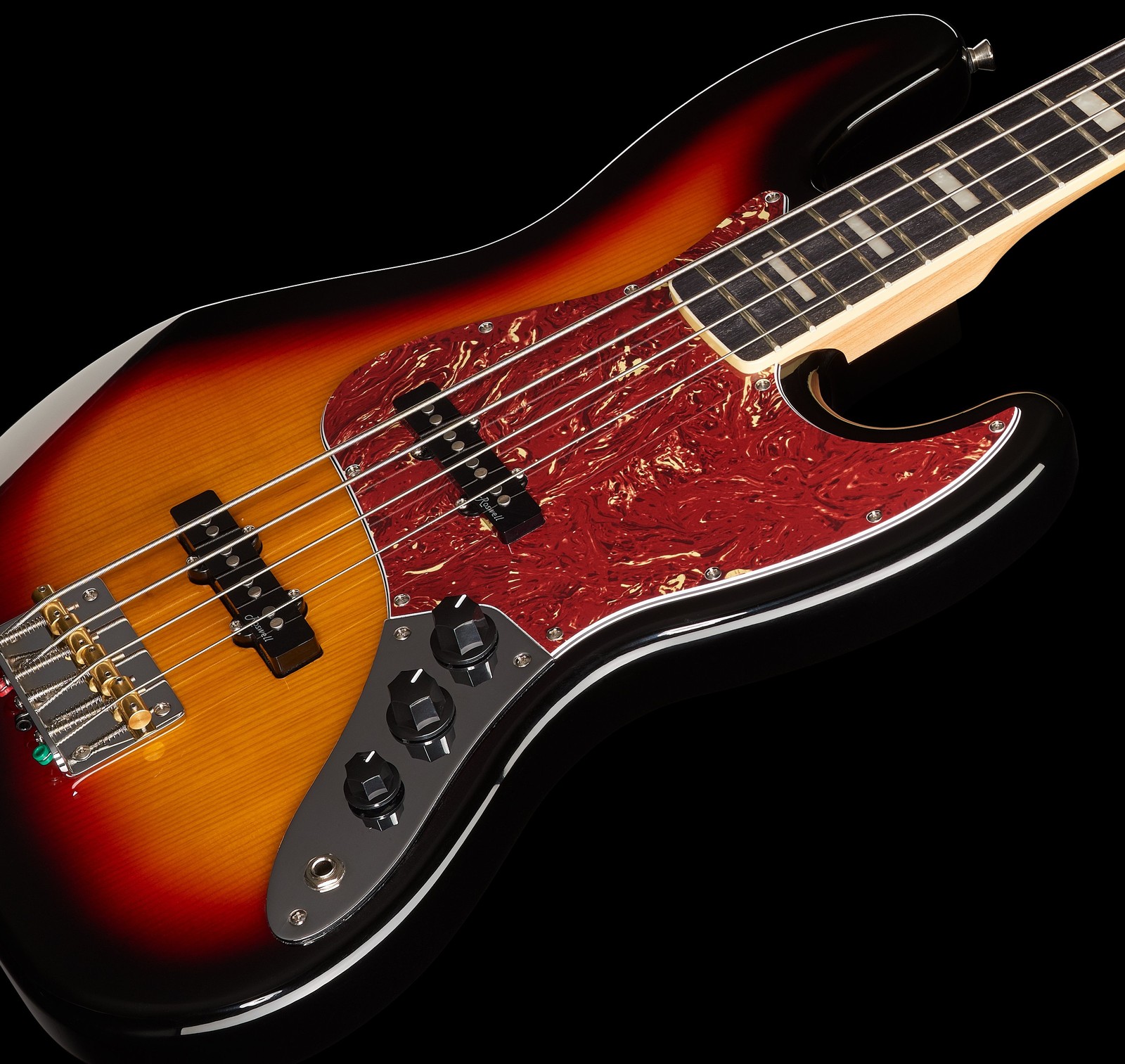 Ein Korpus aus amerikanischer Esche, ein Hals aus kanadischem Ahorn und ein Griffbrett aus Pau Ferro mit 20 Bünden bilden die Basis des Harley Benton JB-75. Das Design mit dem Griffbrettbinding und den Block Inlays sorgen zusammen mit dem 3-Tone Sunburst Finish für den authentischen Vintage Look. Die Sattelbreite von 38 mm und das C-Profil des Halses bieten eine Bespielbarkeit, bei der man sich zu Hause fühlt. Ganz wie beim Vorbild handelt es sich um eine Schraubhalskonstruktion, was entsprechend Attack im Sound liefert. Zwei Roswell JBA AlNiCo V Single Coils und eine passive Elektronik mit den beiden Volume- und einem Tone-Regler bilden die klangliche Schaltzentrale des JB-75. In Kombination mit dem 3-Band-EQ, dem parametrischen Mittenband und dem Kompressor des Harley Benton HB-40B sind bereits einige Soundoptionen möglich.