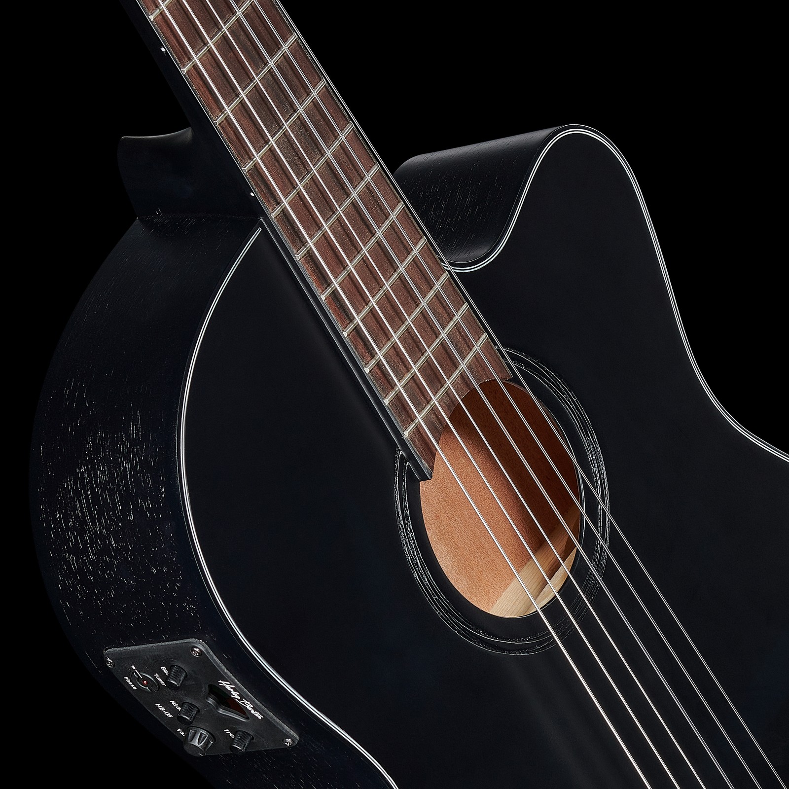 Die Instrumente von Harley Benton bieten schon seit Langem eine ansprechende Qualität für Leute mit nicht so prall gefüllter Brieftasche. Genauso ist es auch mit dieser Konzertgitarre, denn ausgestattet mit Klanghölzern, wie etwa einer Fichtendecke, besitzt die Harley Benton CG-400CE Thinline BK trotz ihres nur 7cm schlanken Thinline-Korpus einen erstaunlich vollen Klang, der im Verhältnis zu Gitarren mit voller Dicke nur etwas weniger tiefe Frequenzen liefert. Außerdem bietet sie ein Spielgefühl, das sich vor weitaus teureren Instrumenten keineswegs verstecken muss. Und während das weit ausgesägte Cutaway ein müheloses Bespielen der oberen Lagen auf dem Griffbrett ermöglicht, sorgt der integrierte Preamp für die Verbindung zu einem Verstärker. Auch optisch kann sich die Akustik in ihrer schwarzen, offenporigen Mattlackierung und dem cremefarbenen Binding an den Seiten des Korpus durchaus sehen lassen – denn das Auge spielt ja bekanntlich immer mit.