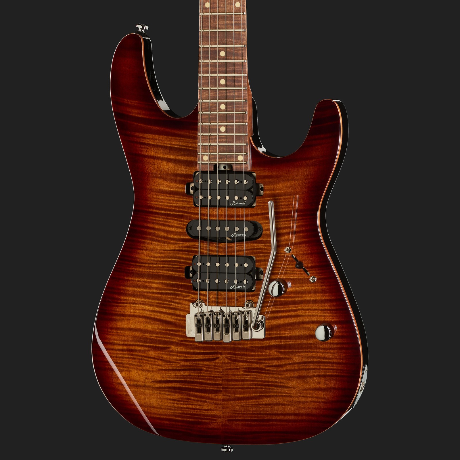 Die Fusion-III HSH Roasted FBB ist durch die Kombination aus geflammter Riegelahornfurnierdecke und transparenter „Bengal Burst“-Lackierung ein echter Blickfang. Der geröstete Ahornhals lässt mit einer Sattelbreite von 42mm und einem modernen C-Profil ein angenehmes Spielgefühl zu. Als besonders langlebig zeigen sich dabei die 24 verschleißfreien Medium-Jumbo-Edelstahlbünde. Hinzu gesellen sich ein Wilkinson-50II-2-Point-Tremolo und WSC-staggered-locking-DieCast-Mechaniken. Die Elektronik besteht aus zwei AlNiCo-5-Humbuckern und einem Roswell Single Coil. Diese werden über einen 5-Wege-Schalter angesteuert und durch Lautstärke- und Tonpoti ergänzt. Das Ton-Poti eröffnet dank Push-Pull-Technik die Möglichkeit, die Humbucker zu splitten. Zusammen mit dem zweikanaligen, mit 3-Band-EQ und Halleffekt ausgestatteten HB-20R Amp ergibt sich so ein breitgefächertes Klangspektrum.