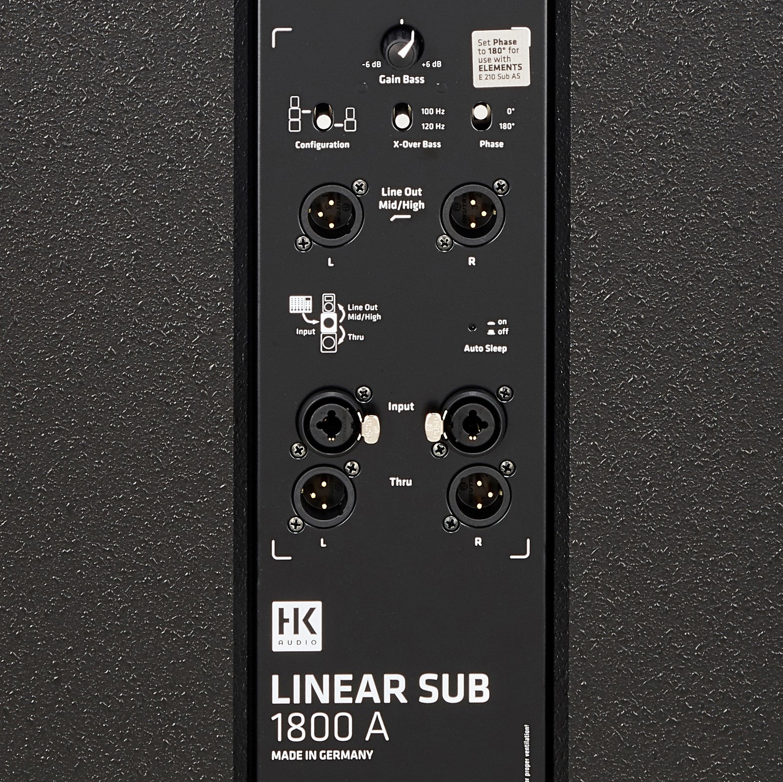 Der HK Audio L Sub 1800 A ist ein aktiver Subwoofer mit einer 18"-Membran, der die Fullrange-Lautsprecher der HK Audio Linear 5-Reihe um tiefe Töne ergänzt. Die eingebaute Class-D-Endstufe des Basslautsprechers liefert einen Spitzenpegel von 130 dB SPL und seine Wiedergabe reicht hinab bis 42 Hz. Combo-Buchsen für XLR- und Klinkenstecker sorgen für einfache und sichere Audioverbindungen. Zwei Ausgänge für Top-Speaker und zwei Ausgänge mit einem vor dem Cutoff abgegriffenen Thru-Signal sparen Kabellänge beim Kombinieren des Subs mit weiteren Speakern. Die Trennfrequenz des Subwoofers lässt sich bei 100 beziehungsweise 120 Hz wählen, um ihn auf verschiedene Top-Speaker abstimmen zu können. Die Lautstärke des Bass-Speakers ist in einem Regelbereich von 12 dB stufenlos justierbar.
