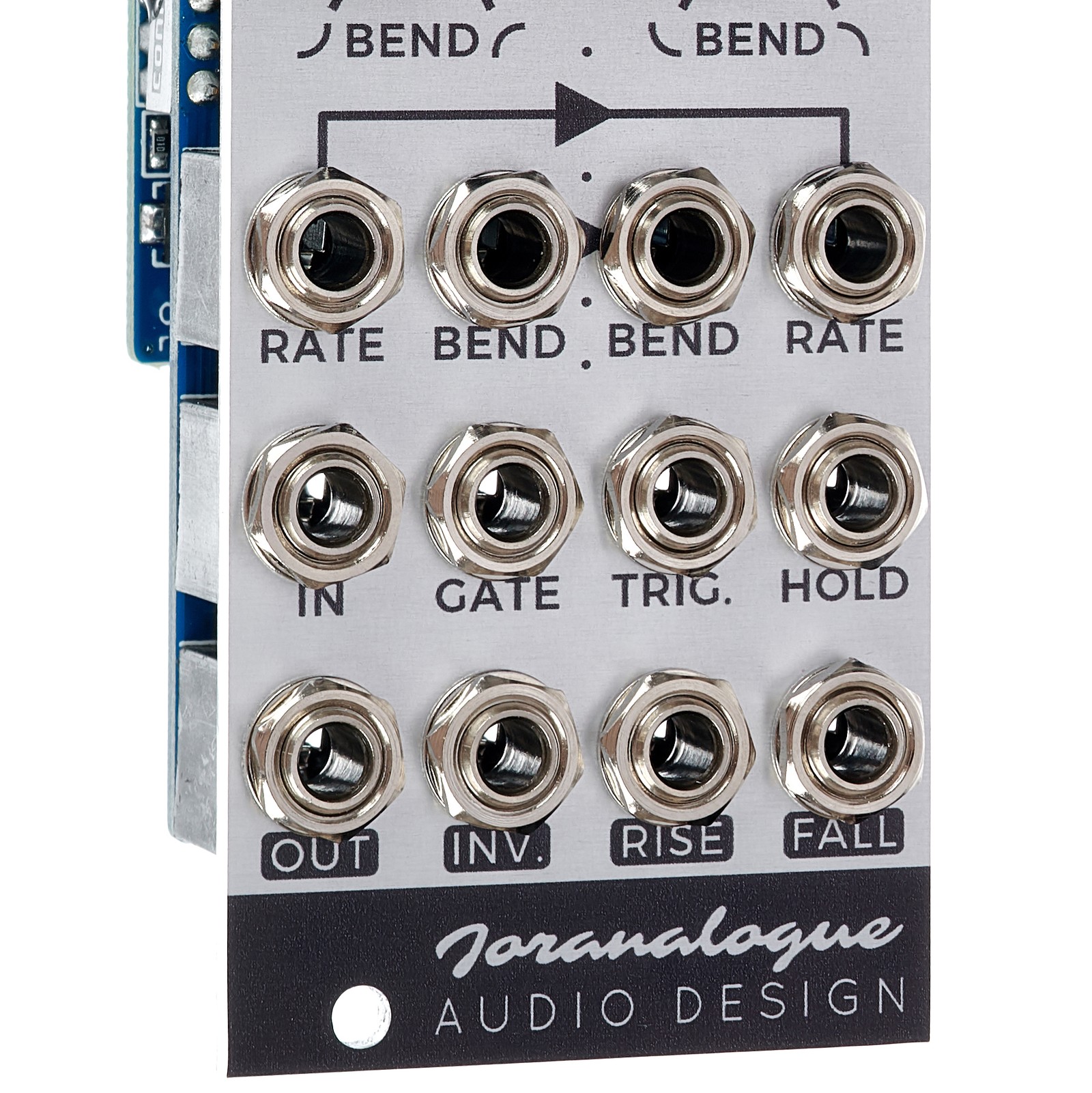 Rise und Fall sind Zeitparameter, die das Ansteigen und Absinken eines Signalpegels steuern. Mit dieser simplen Funktionalität kann das Modul für ganz unterschiedliche Zwecke eingesetzt werden. Führt man dem Modul eine Key-CV von einem Keyboard oder Sequenzer zu, kann der Wechsel zwischen den Tonhöhen verzögert werden. Dieser Vorgang wiederum erzeugt ein Portamento bzw. einen Slide-Effekt, der sich dann detailliert formen lässt. Über die Gate- und Trigger-Eingänge kann das Modul angetriggert werden und dank Rise und Fall eine AR- bzw. AD-Hüllkurve generieren. Mit 500 µs agiert die Hüllkurve ohnehin bereits sehr schnell, doch durch die Anpassung der Kennlinien wird das Signal erst richtig „snappy“. Im VCO-Modus reicht die Geschwindigkeit bis zu 16 kHz, während sich das Pitch Tracking mit einem Trimmer am Frontpanel kalibrieren lässt.