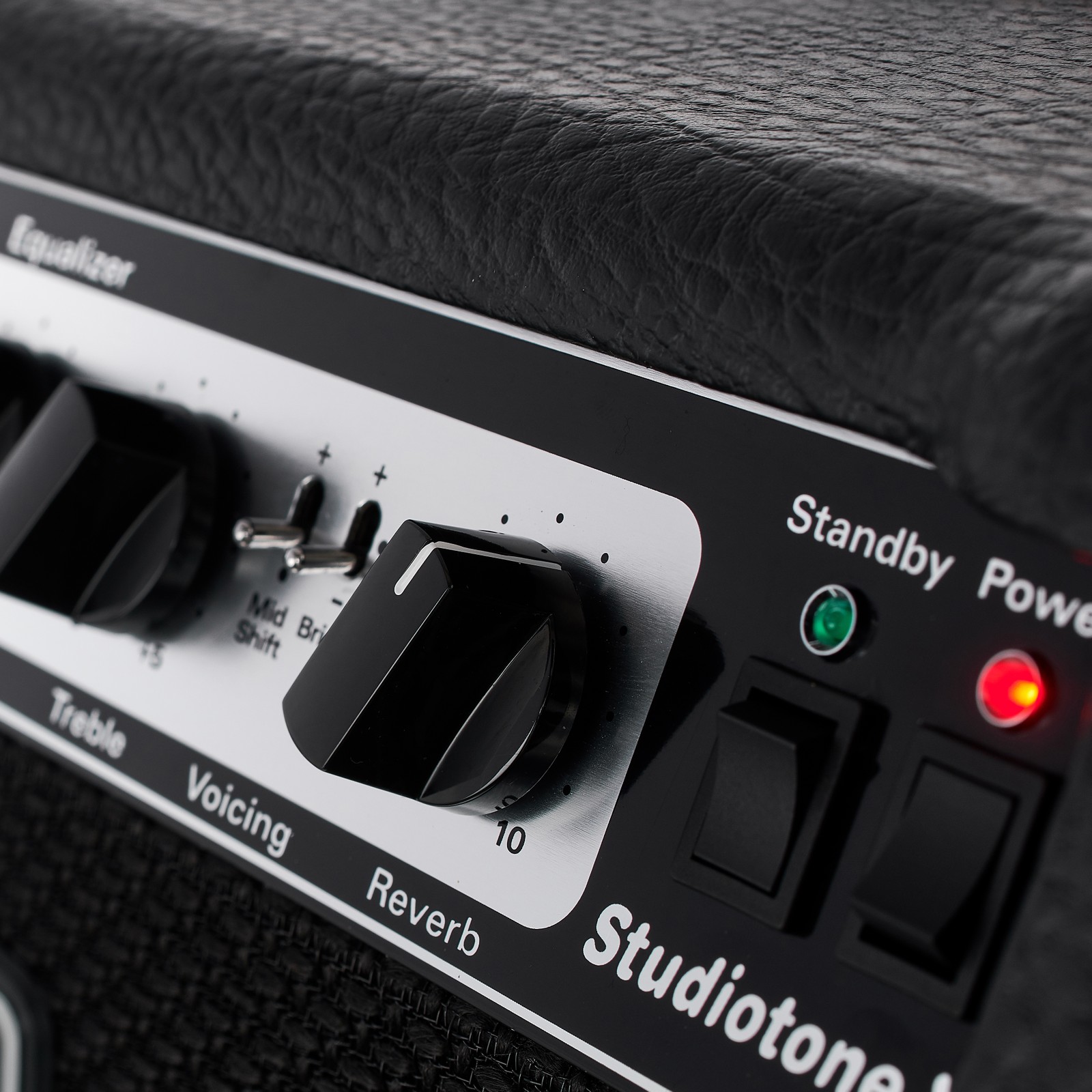 Der Studiotone XL Combo ist sowohl für den Einsteiger als auch für Fortgeschrittene, die auf der Suche nach einem erstklassig klingenden und umfangreich ausgestatteten Röhrenverstärker sind, eine Option. Die Bedienung ist denkbar einfach und dank der drei Kanäle sowie der Möglichkeit, den Sound mit den zwei Voicings und dem kraftvoll zupackenden Dreiband-EQ in viele Richtungen zu biegen, erhält man mit dem Studiotone XL Combo einen Gitarren-Amp, der in seinem Klangverhalten, seiner Lautstärke, dem Schalldruck und seiner offenen Dynamik kaum Wünsche offenlässt. Zum Lieferumfang gehört zudem ein Fußschalter, mit dem sich zwischen Clean- und Overdrive und den zusätzlichen Zerrstufen wählen lässt und der mit einem Kabel in praxisgerechter Länge ausgerüstet ist.